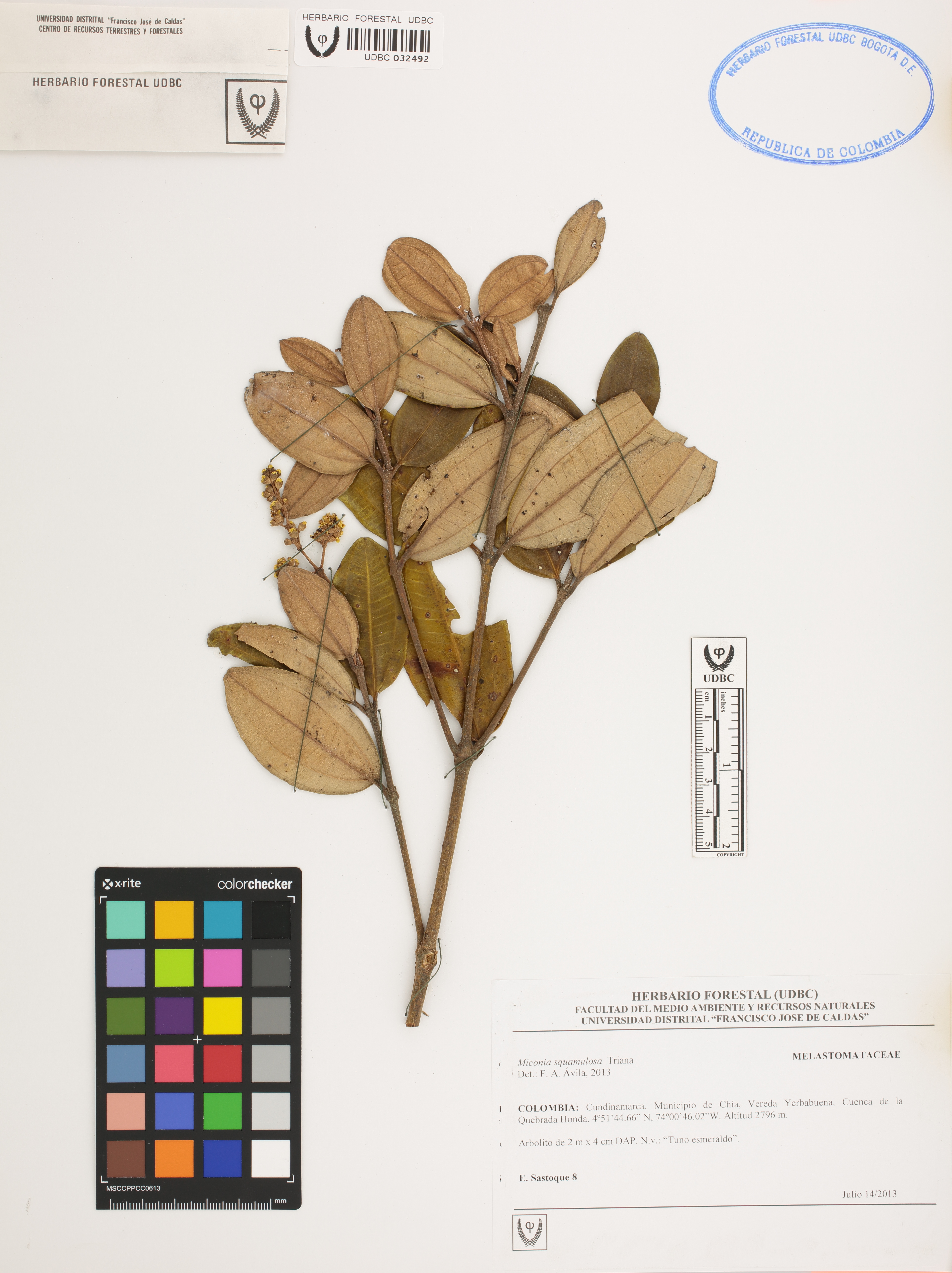 Fotografía del ejemplar Sastoque, E. 8, determinado como Miconia squamulosa en el año 2013