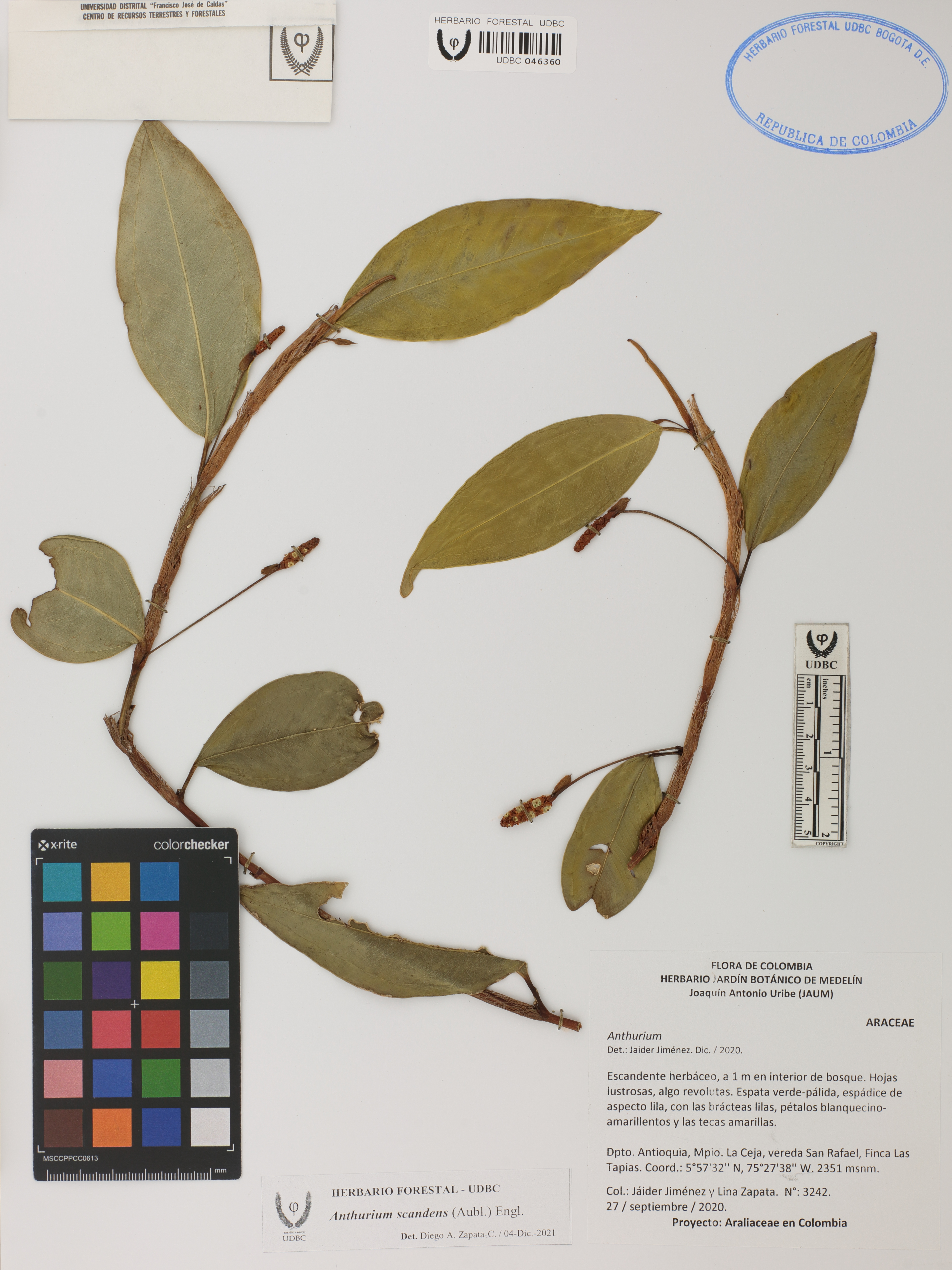 Fotografía del ejemplar Jiménez, J. 3242, determinado como Anthurium scandens en el año 2021