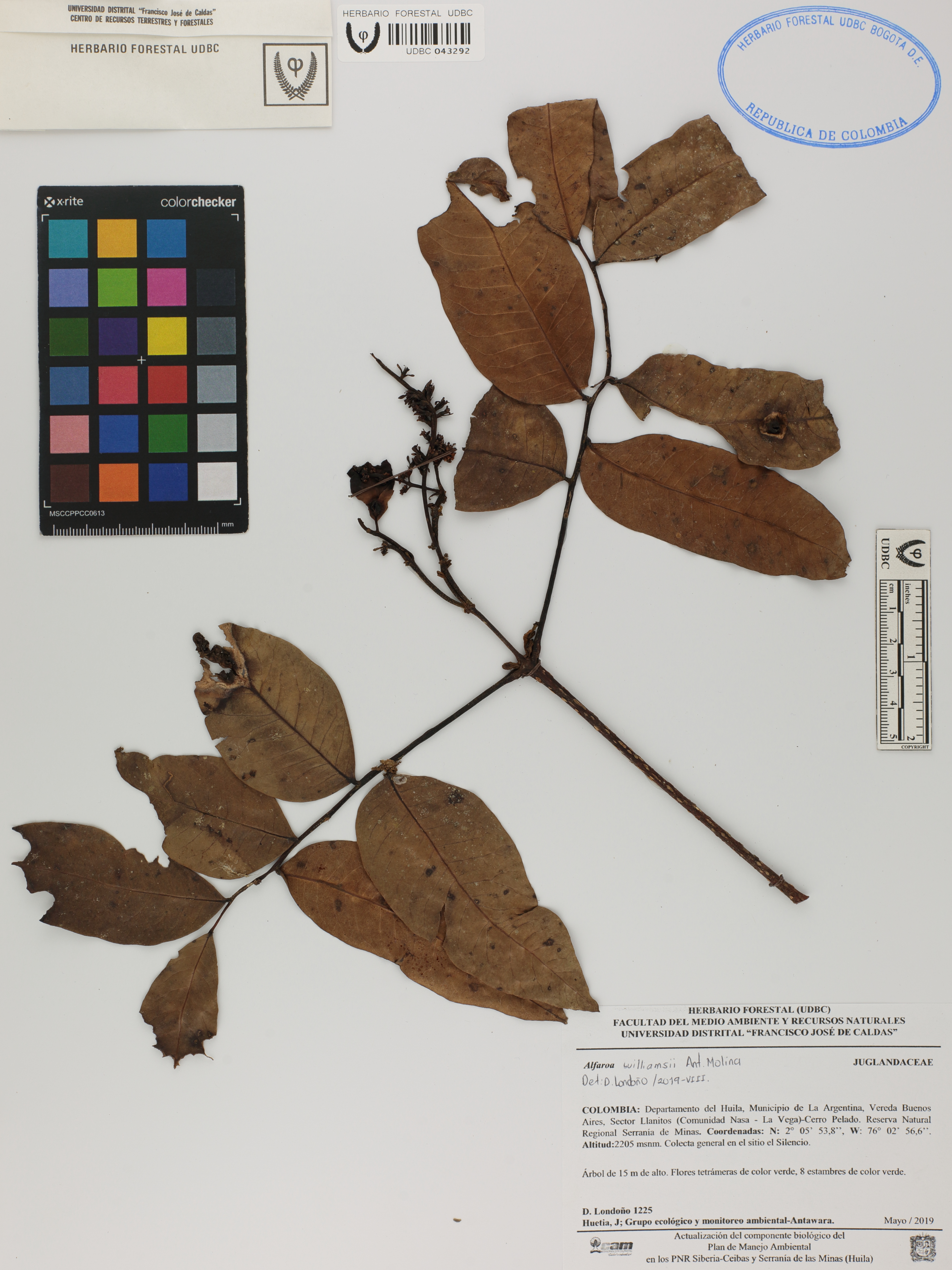 Fotografía del ejemplar Londoño, D. 1225, determinado como Alfaroa williamsii en el año 2019
