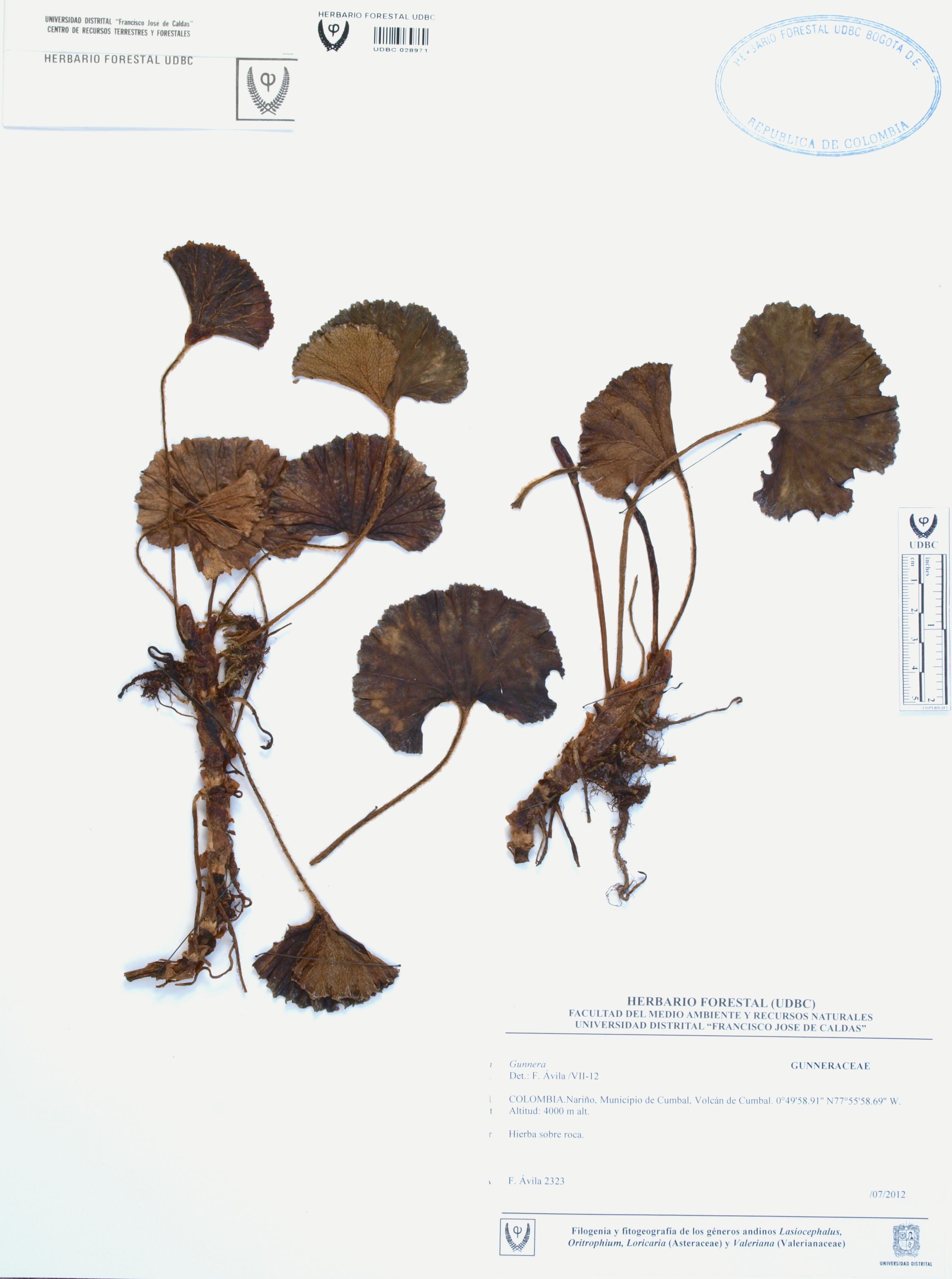 | dc.description | Fotografía del ejemplar Ávila, F. 2323, determinado como Gunnera sp. en el año 2012 | |
