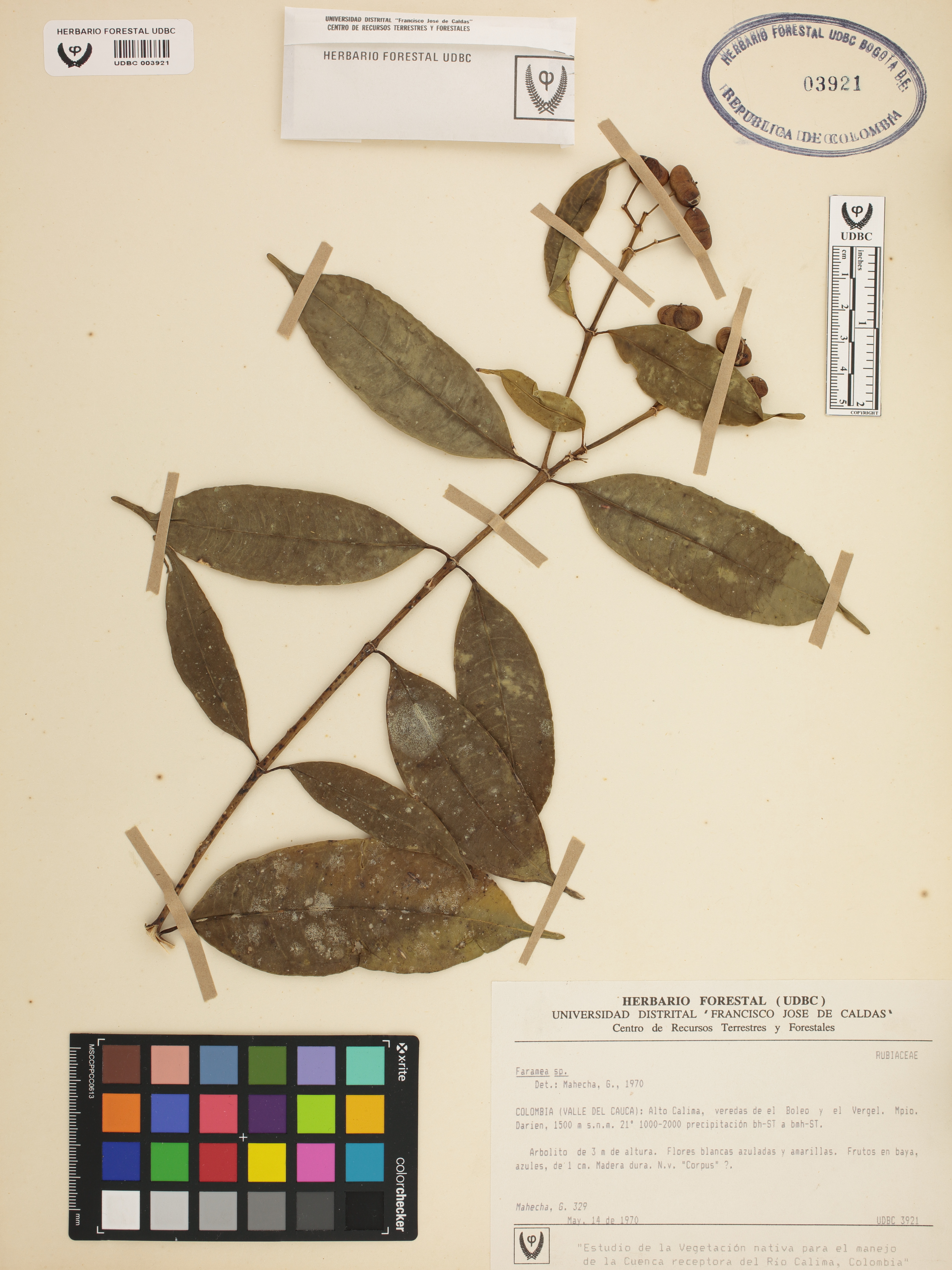 Fotografía del ejemplar Mahecha, G. 329, determinado como Faramea sp. en el año 1970