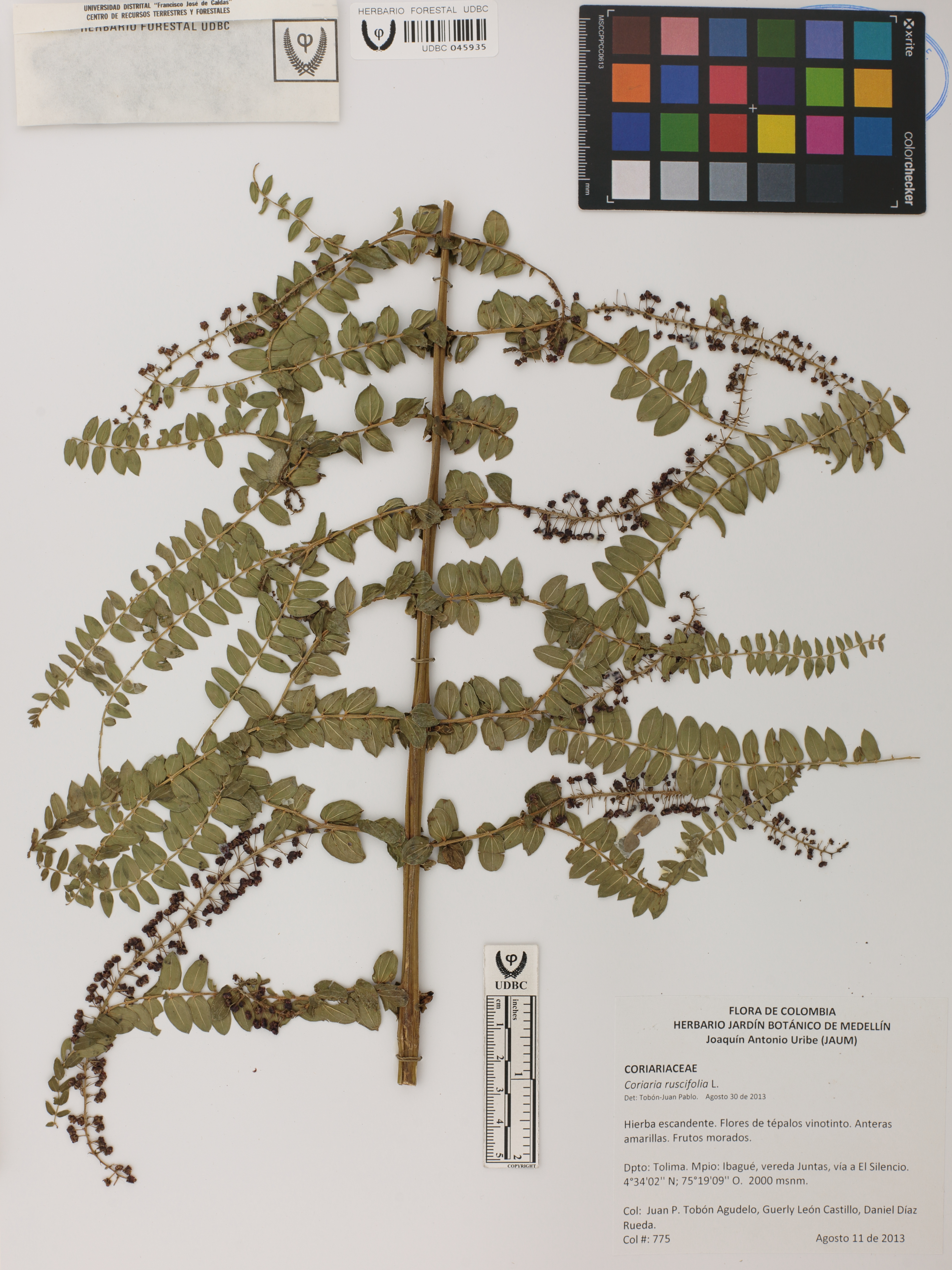 Fotografía del ejemplar Tobón-Agudelo, J. 775, determinado como Coriaria ruscifolia en el año 2013