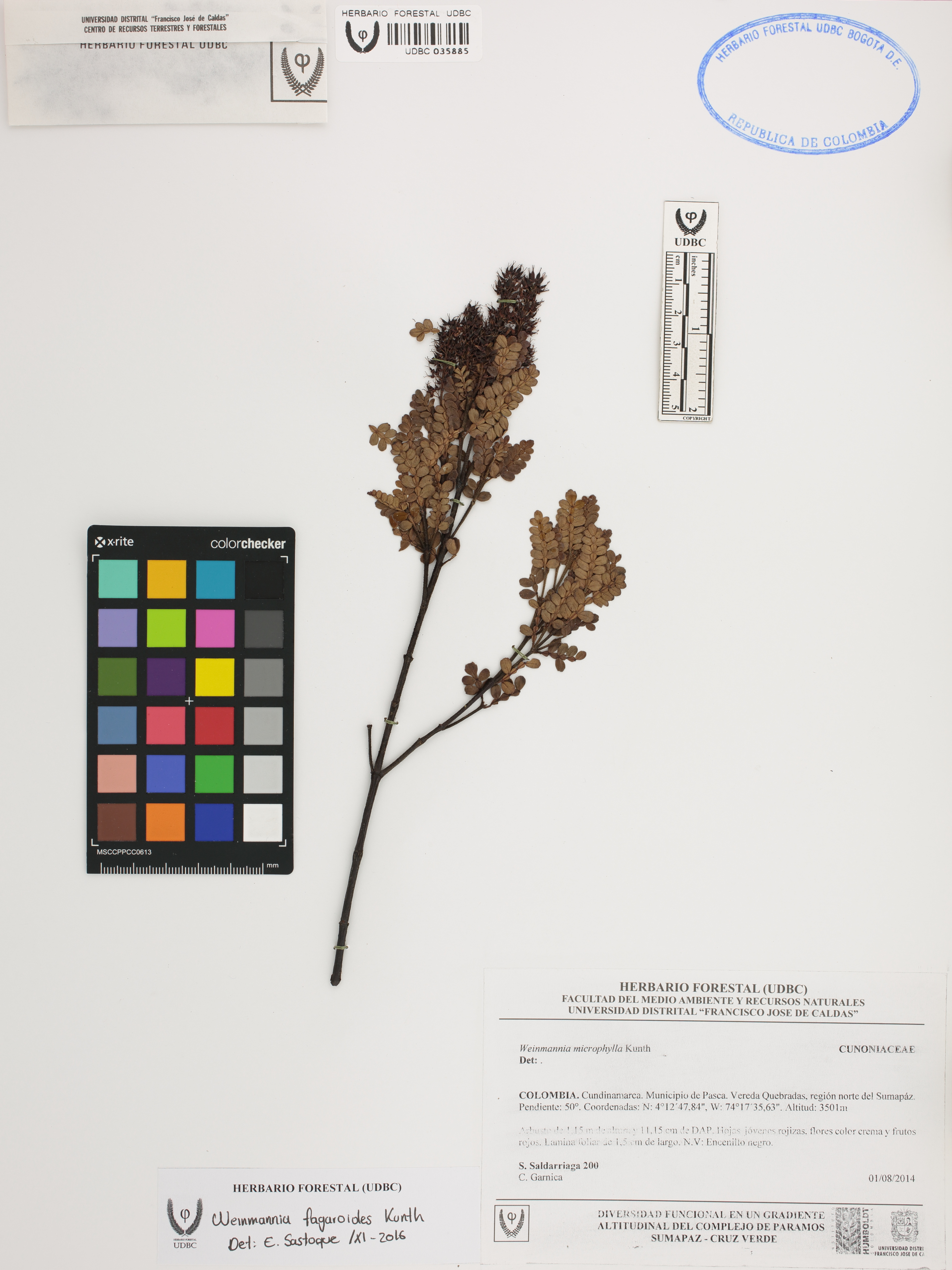 Fotografía del ejemplar Saldarriaga, S. 200, determinado como Weinmannia fagaroides en el año 2016
