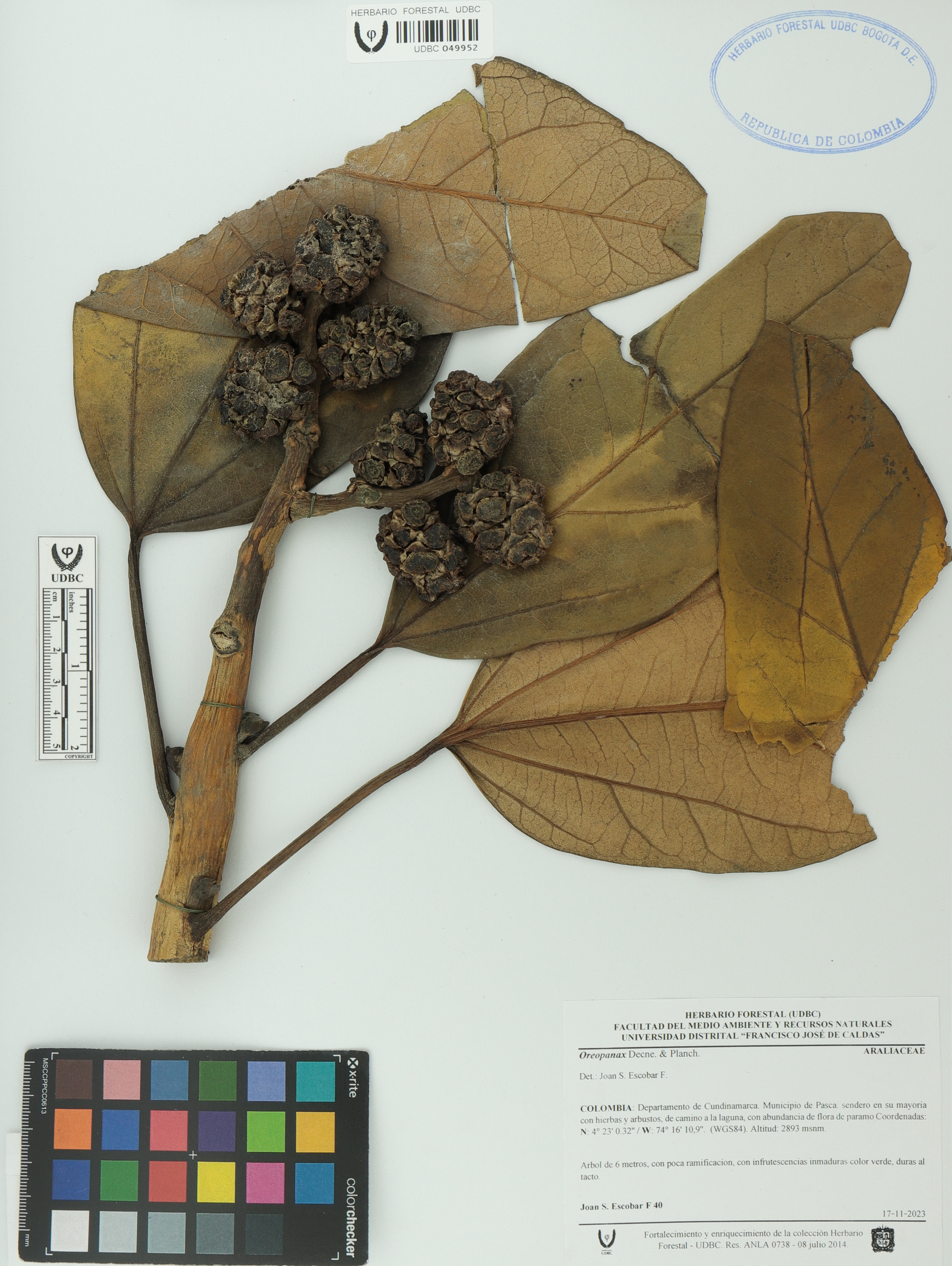 Fotografía del ejemplar Escobar, J. 40, determinado como Oreopanax sp.
