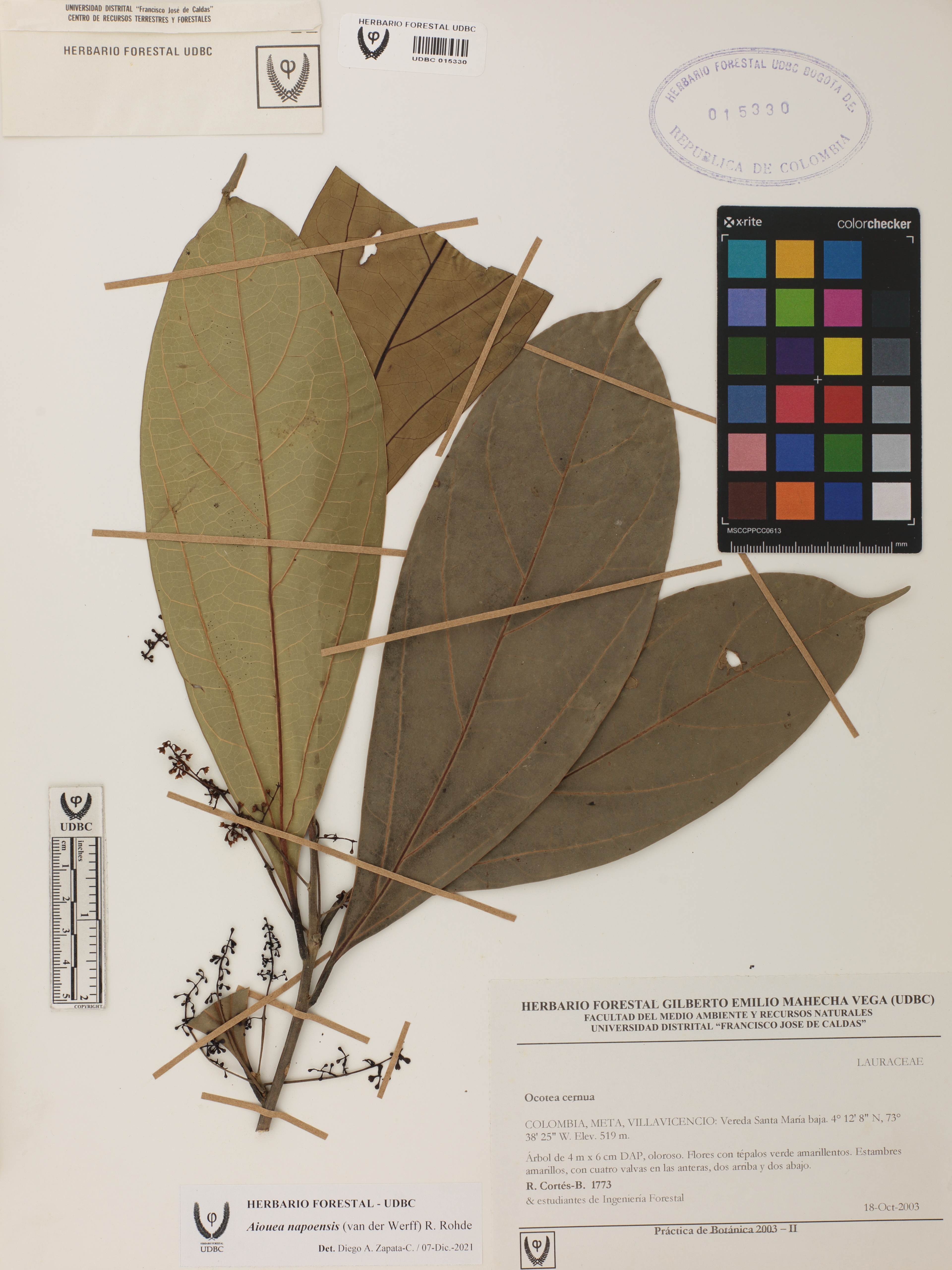 Fotografía del ejemplar Cortés-B., R. 1773, determinado como Aiouea napoensis en el año 2021