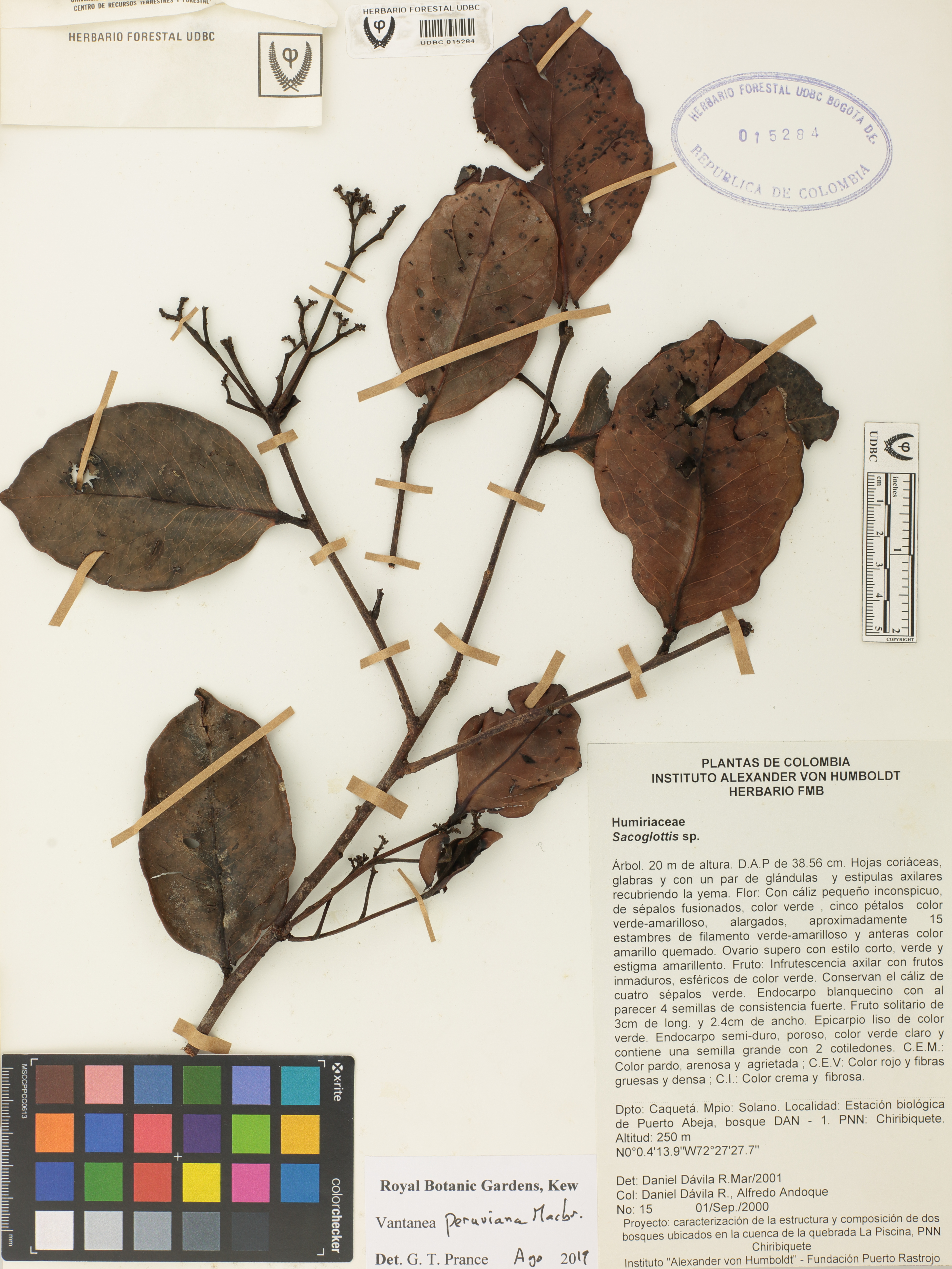 Fotografía del ejemplar Dávila, D. 15, determinado como Vantanea peruviana en el año 2019