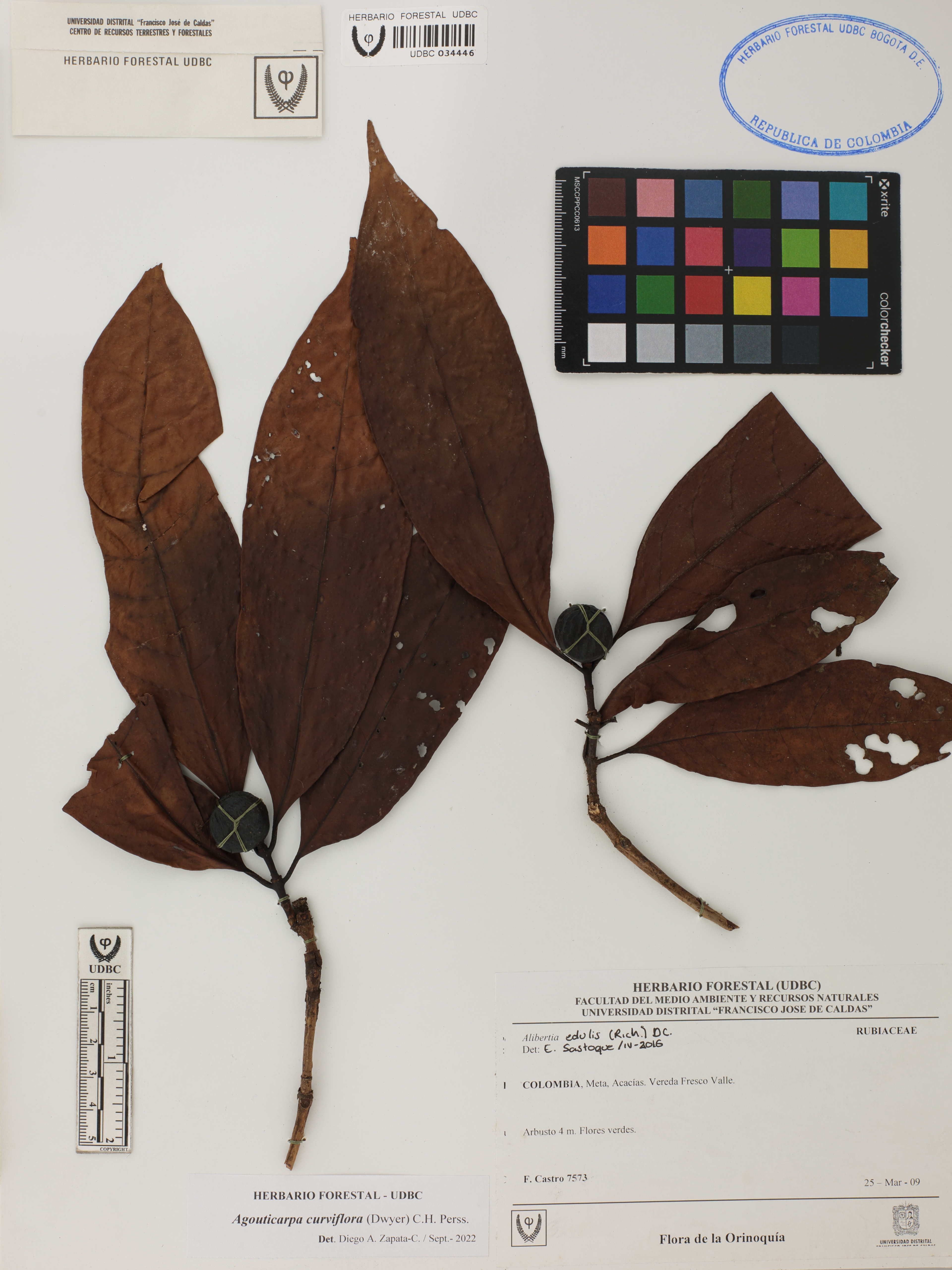 | dc.description | Fotografía del ejemplar Castro, F. 7573, determinado como Agouticarpa curviflora en el año 2022 | |