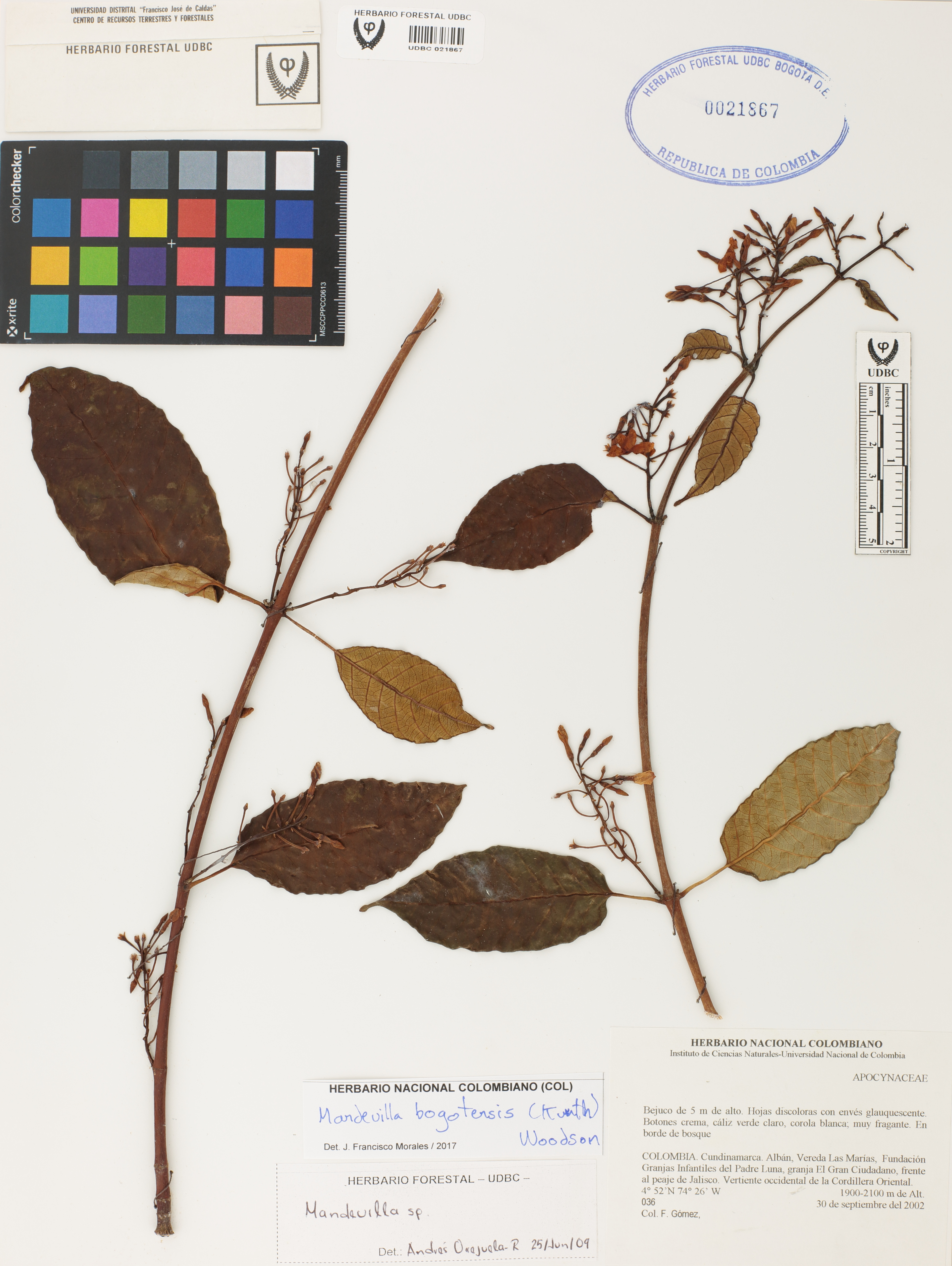 Fotografía del ejemplar Gómez, F. 36, determinado como Mandevilla bogotensis en el año 2017