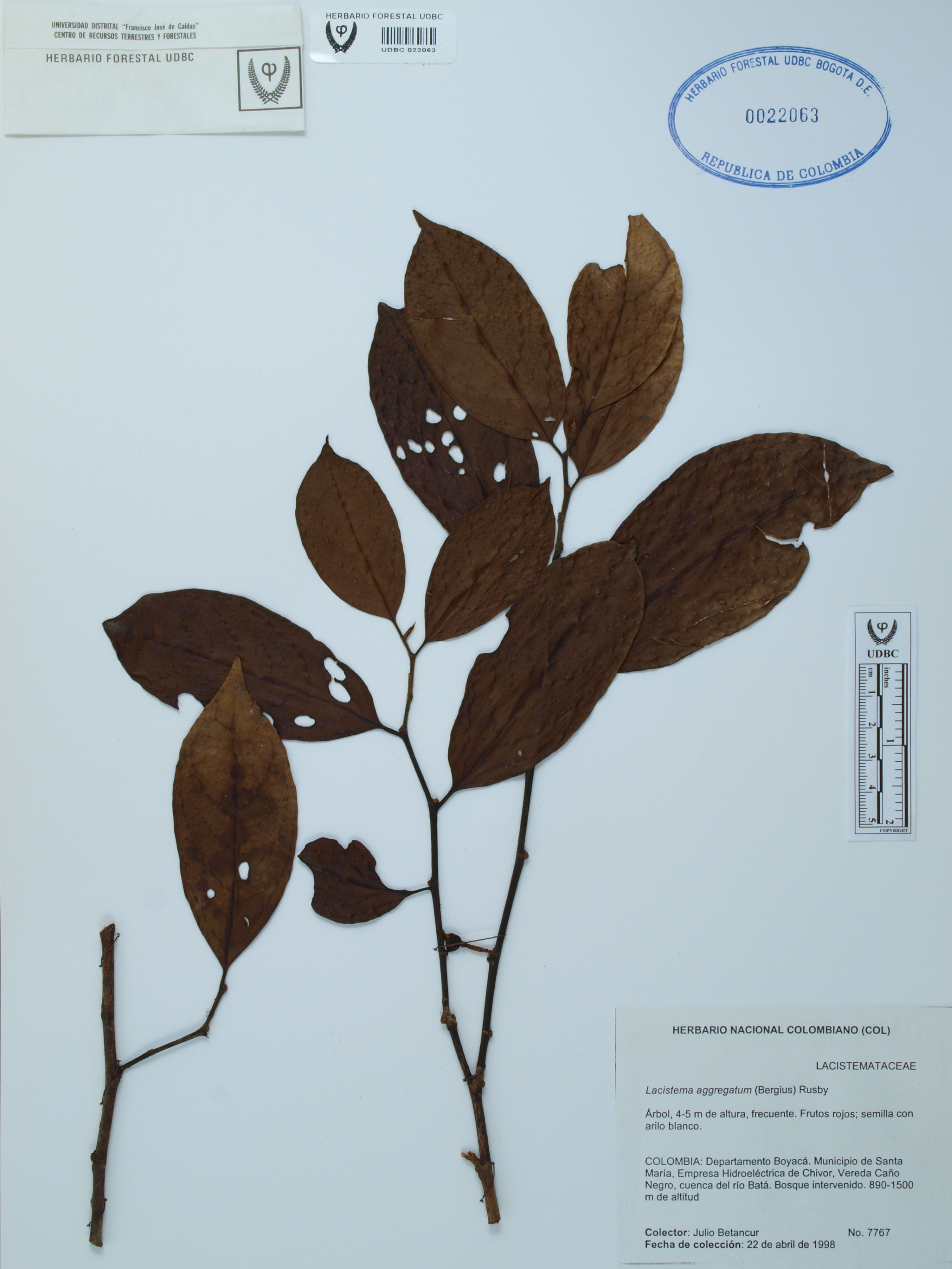 Fotografía del ejemplar Betancur, J. 7767, determinado como Lacistema aggregatum