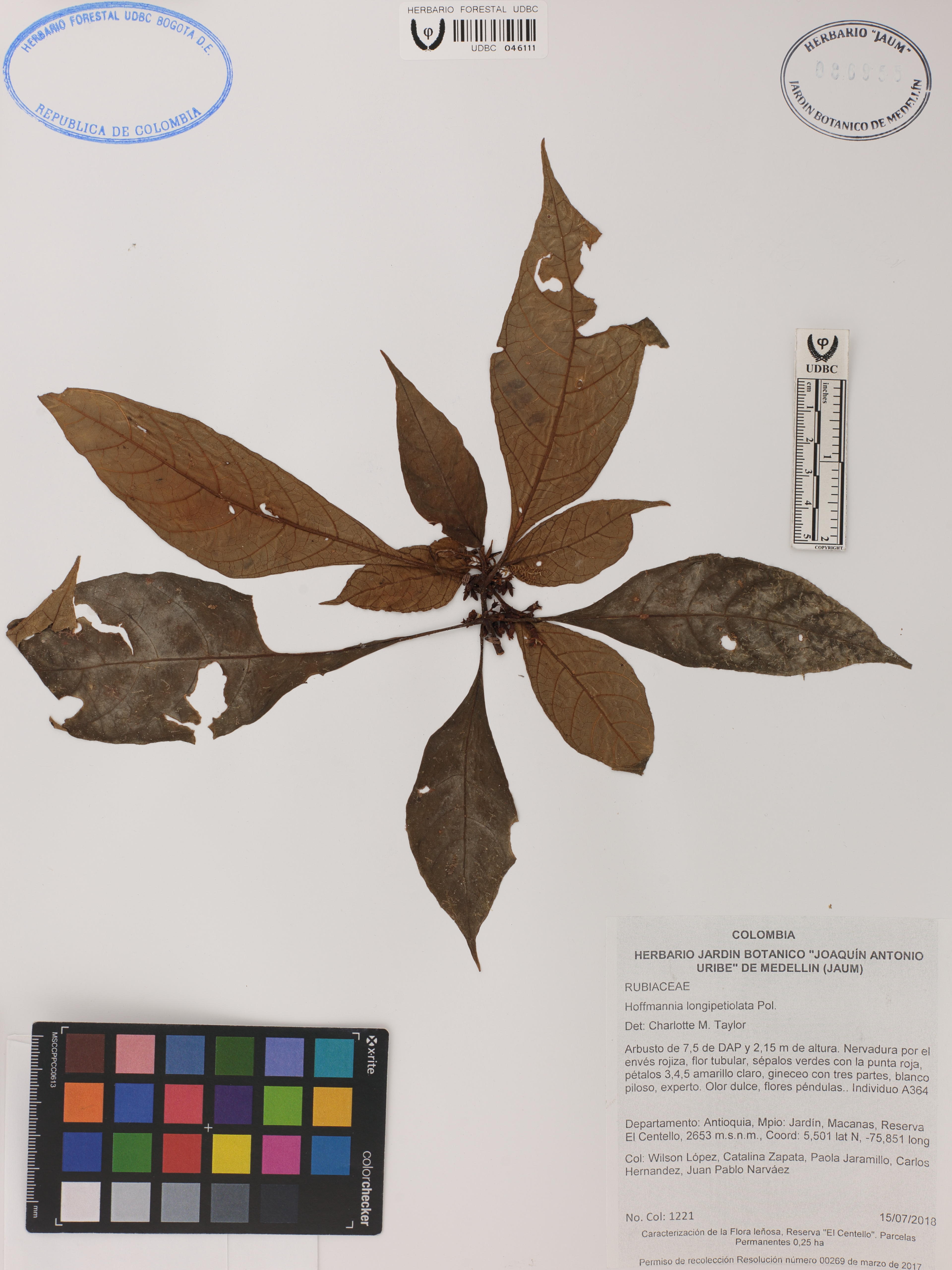 Fotografía del ejemplar López, W. 1221, determinado como Hoffmannia longipetiolata en el año 2018