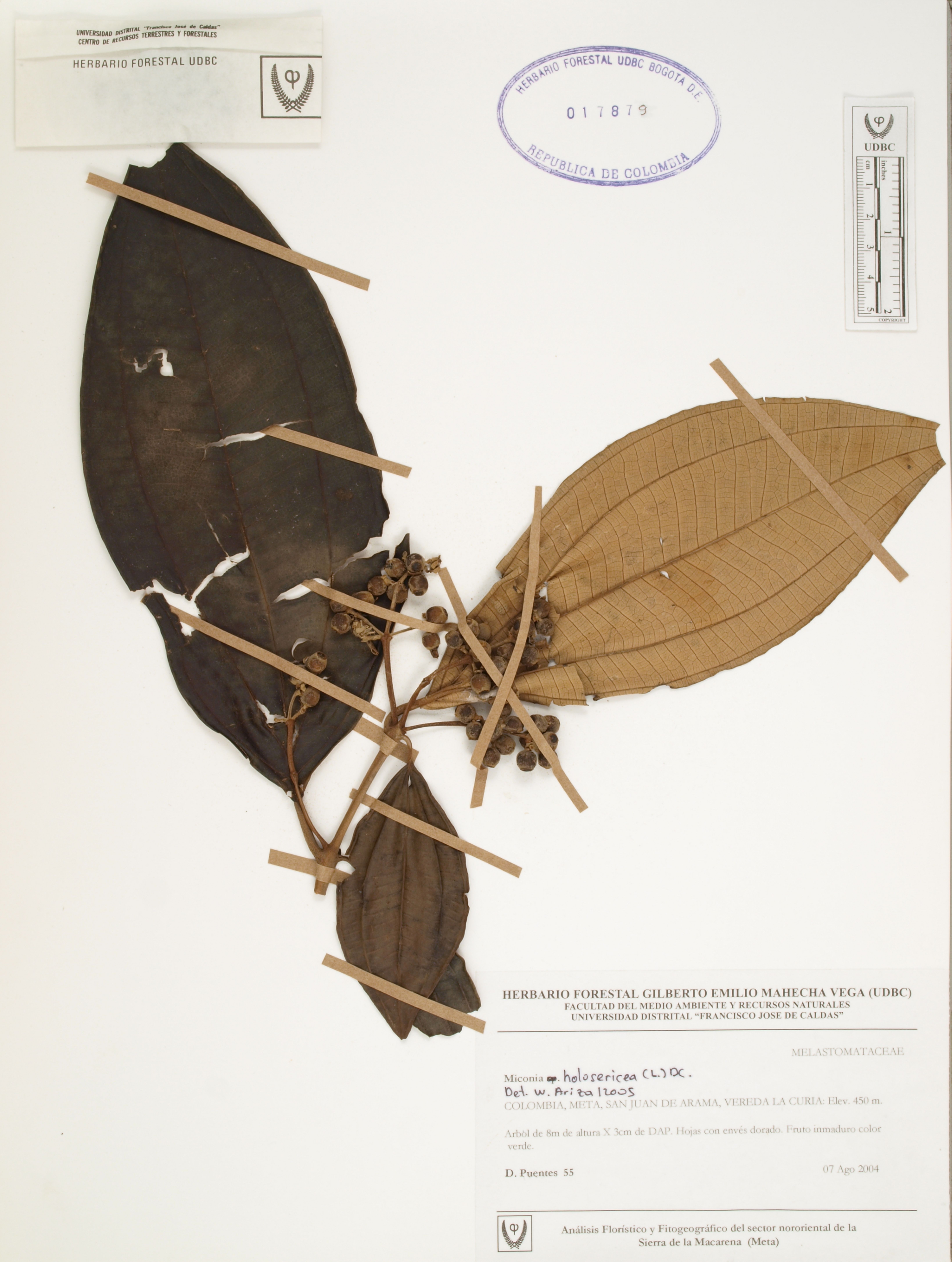 Fotografía del ejemplar Puentes, D. 55, determinado como Miconia holosericea en el año 2005