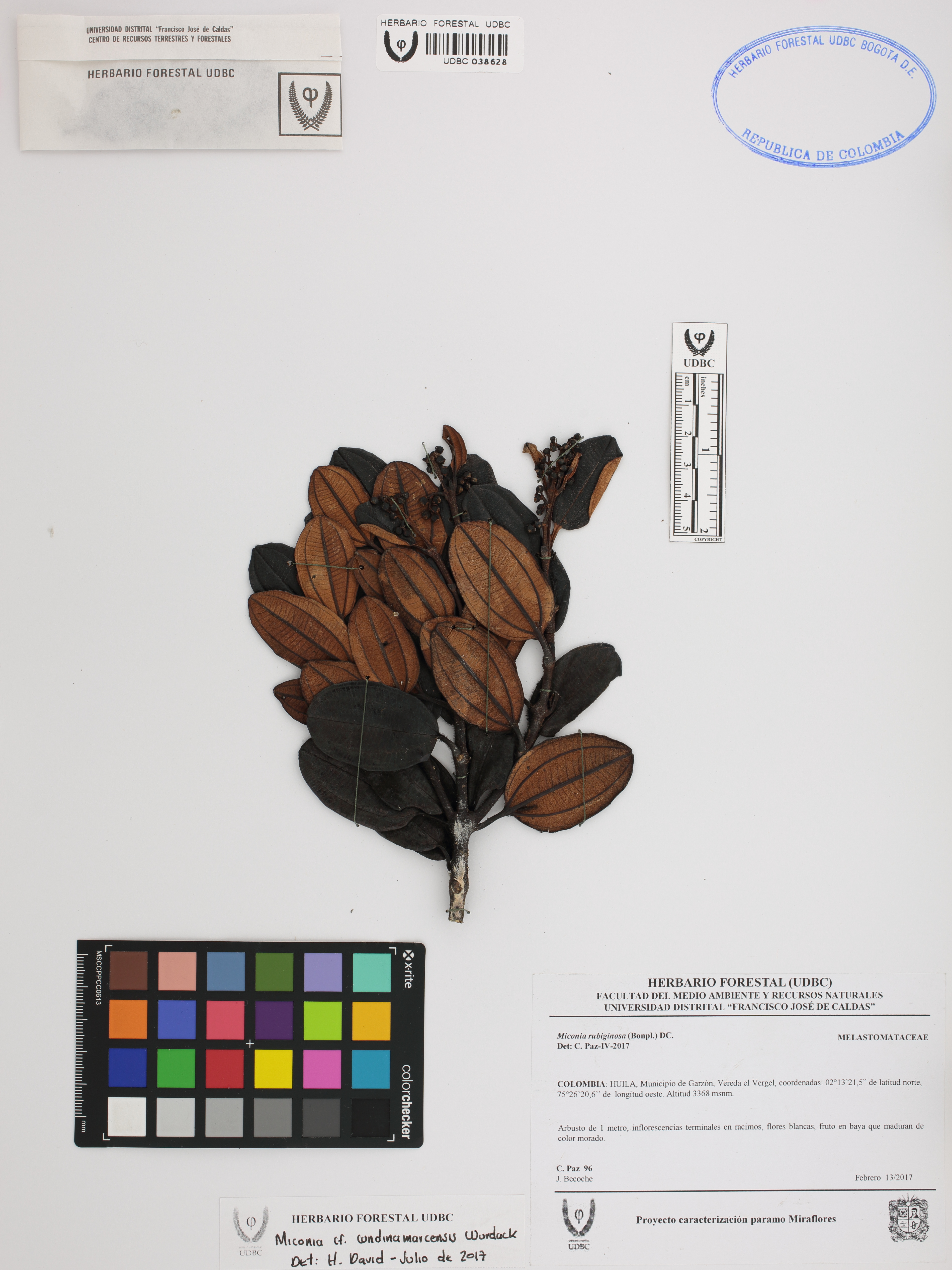 Fotografía del ejemplar Paz, C. 96, determinado como Miconia cundinamarcensis en el año 2017