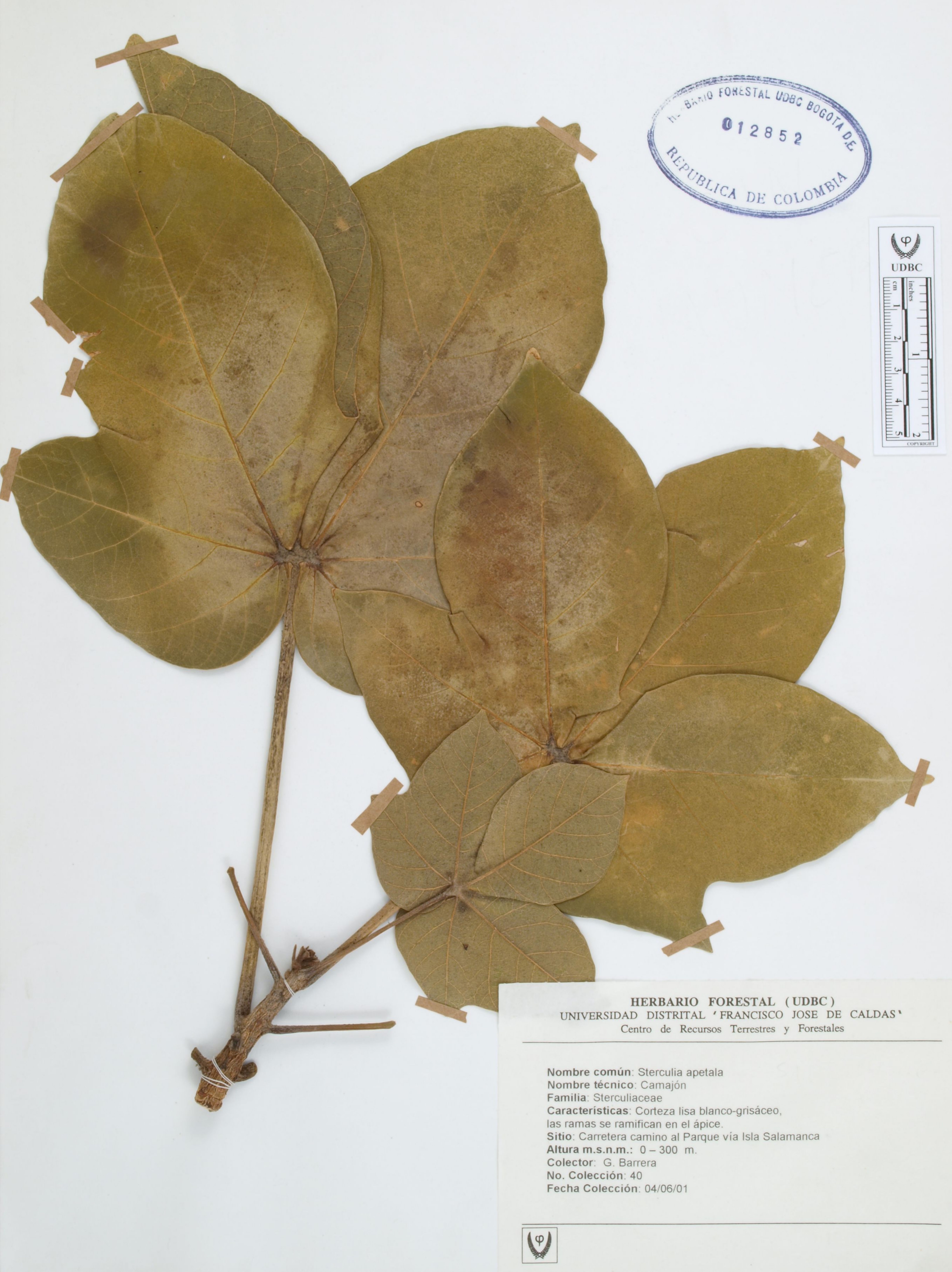 Fotografía del ejemplar Barrera, G. 40, determinado como Sterculia apetala