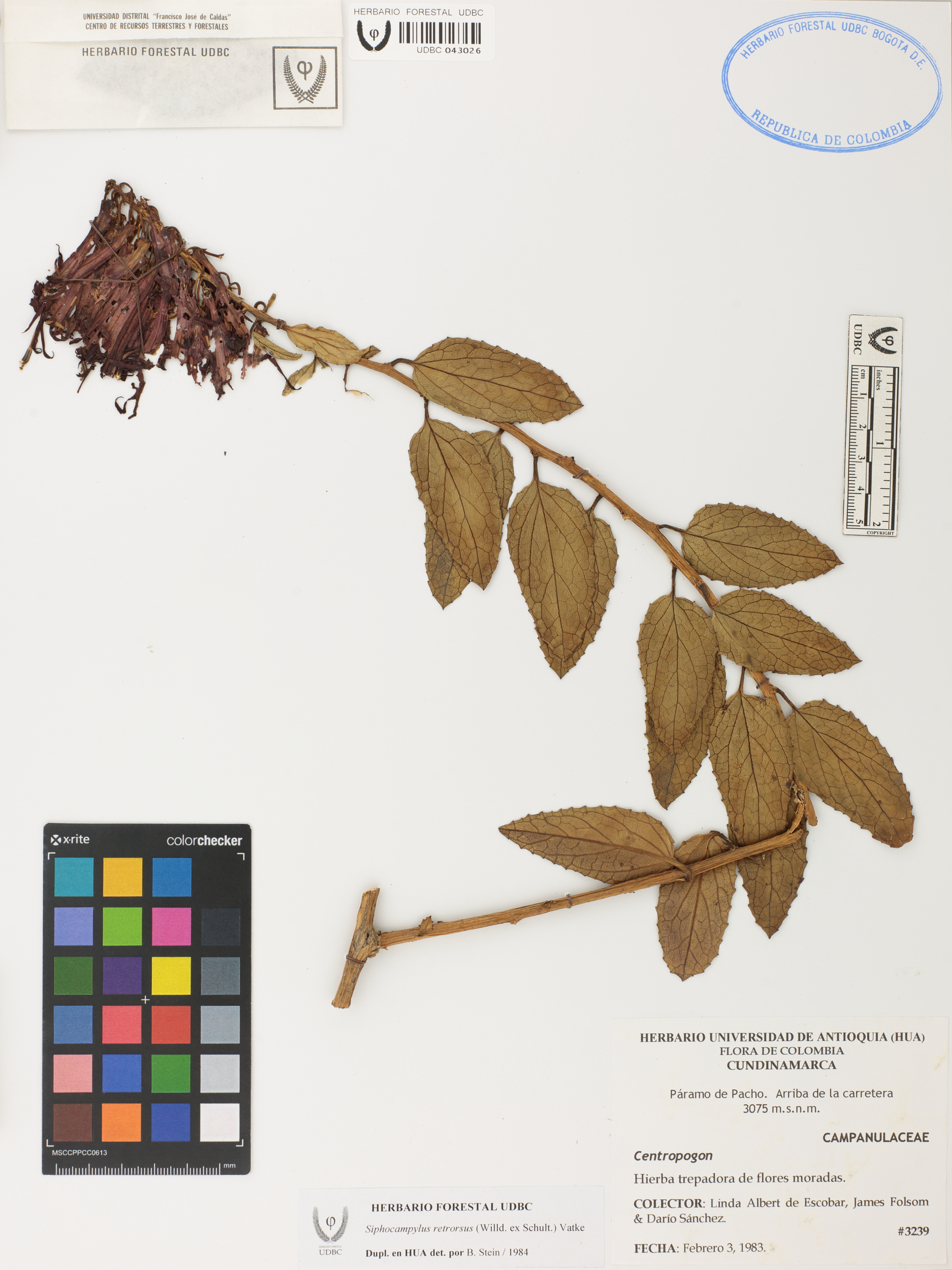 Fotografía del ejemplar Albert de Escobar, L. 3239, determinado como Siphocampylus retrorsus