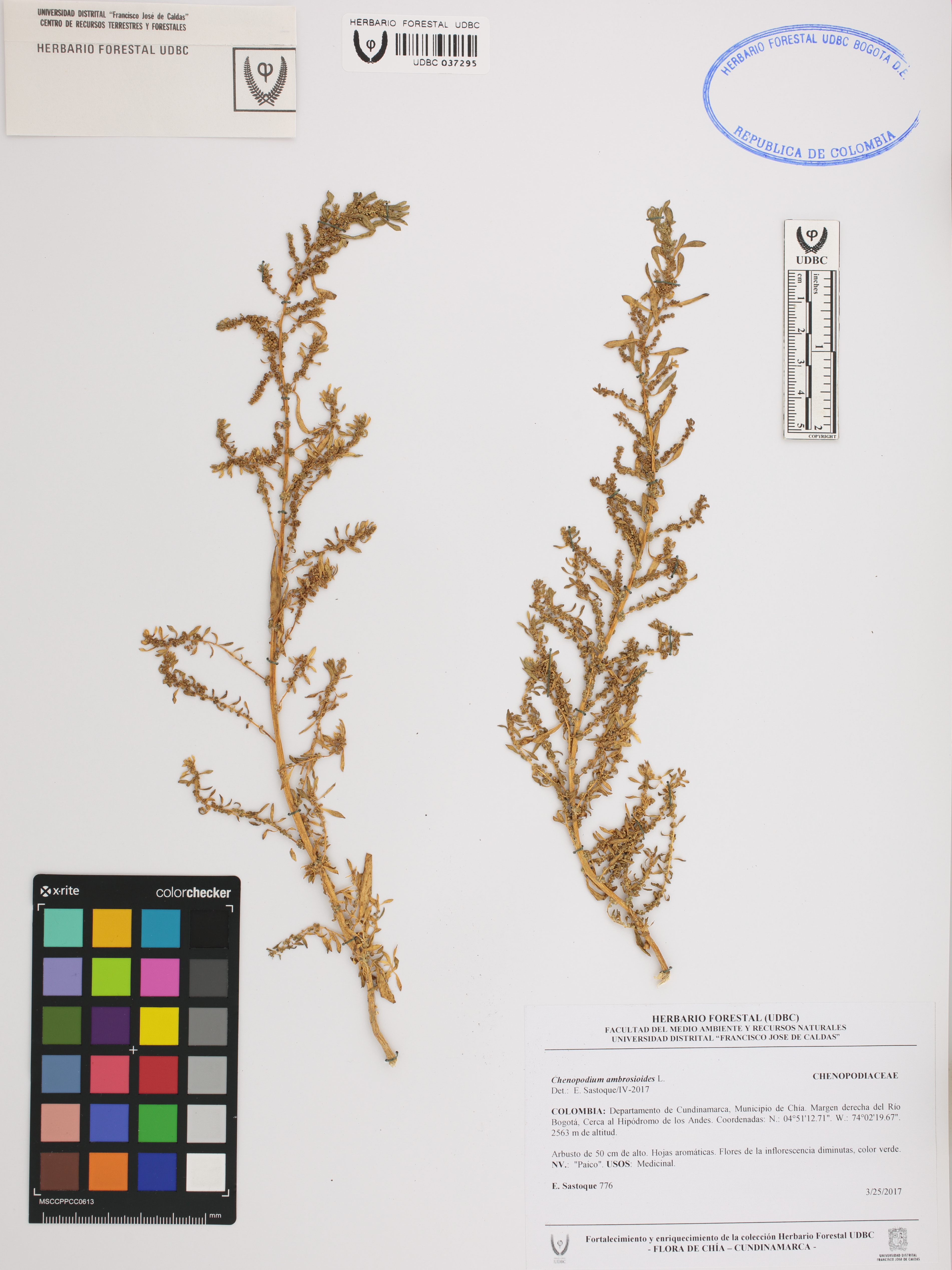 | dc.description | Fotografía del ejemplar Sastoque, E. 776, determinado como Dysphania ambrosioides en el año 2017 | |