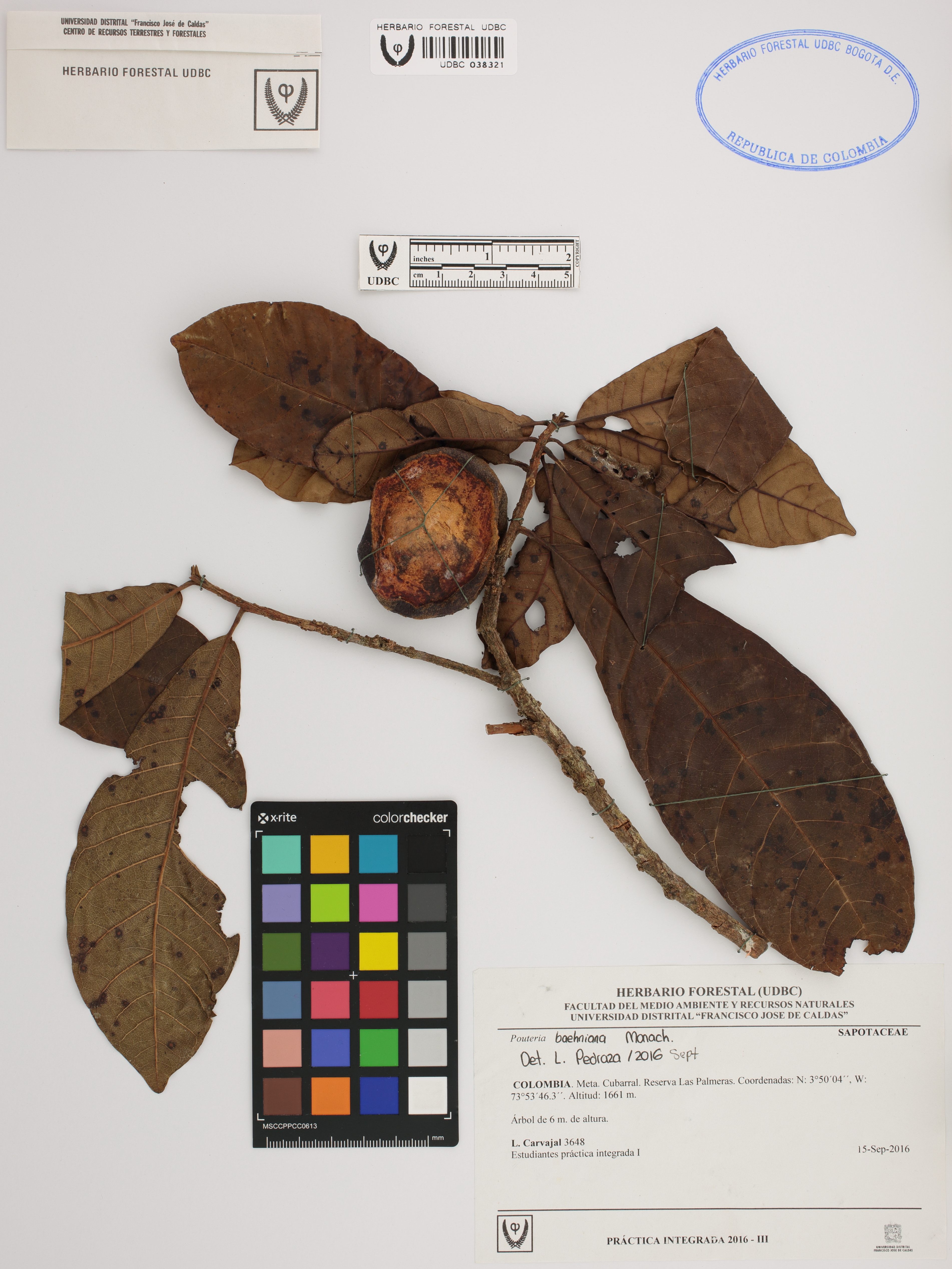 Fotografía del ejemplar Carvajal, L. 3648, determinado como Pouteria baehniana en el año 2016