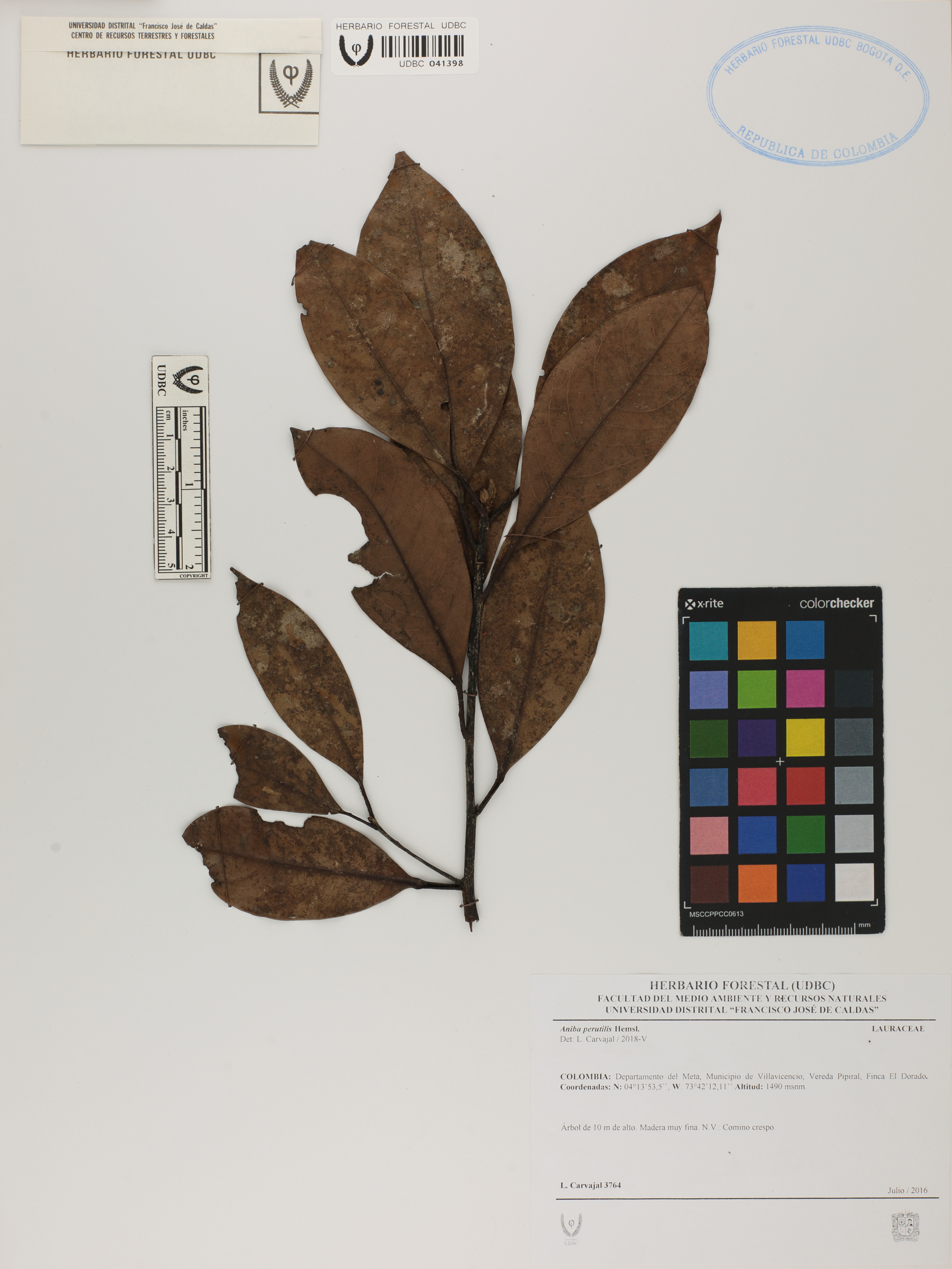 Fotografía del ejemplar Carvajal, L. 3764, determinado como Aniba perutilis en el año 2018