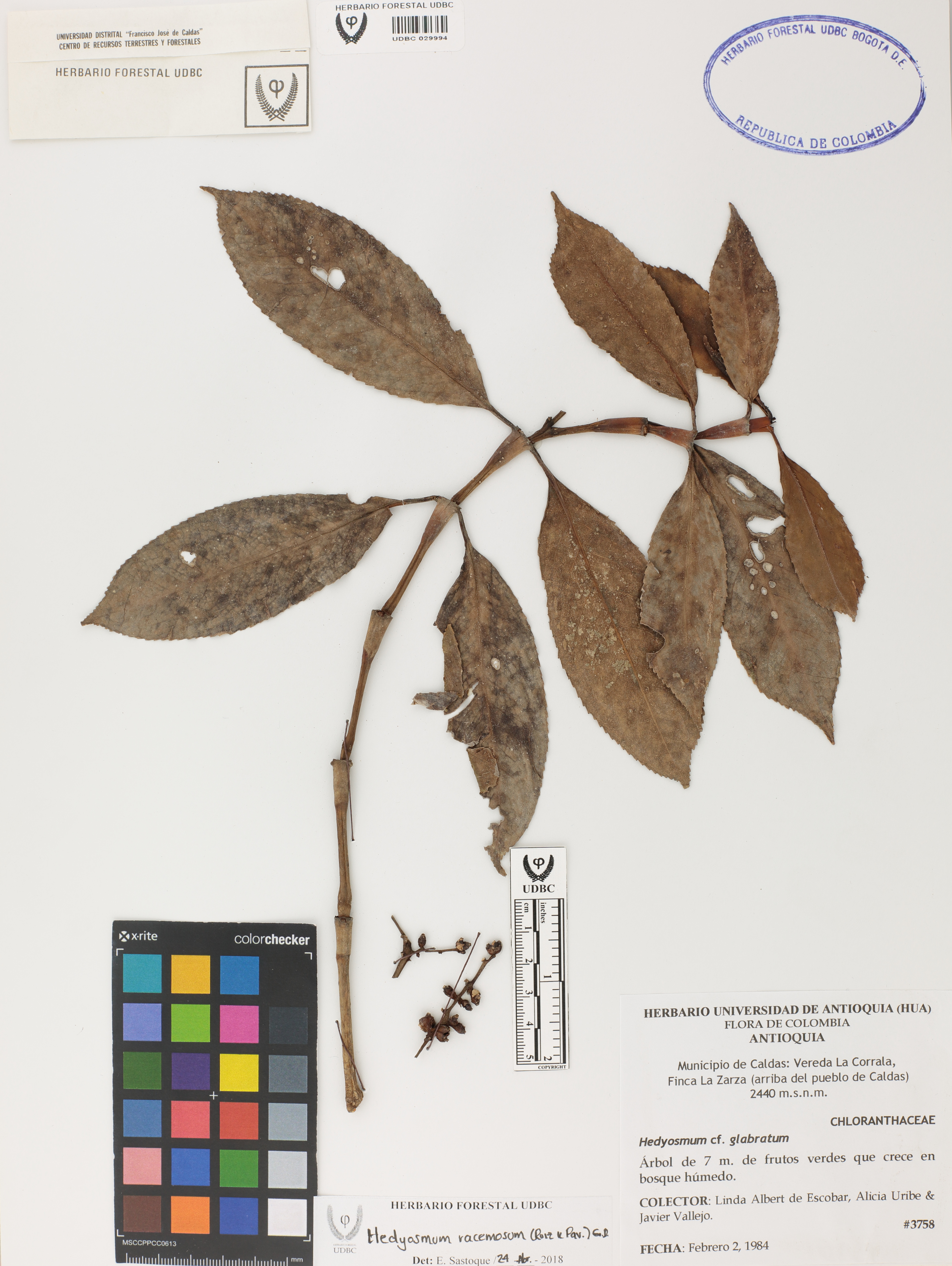 Fotografía del ejemplar Albert de E., L. 3758, determinado como Hedyosmum racemosum en el año 2018
