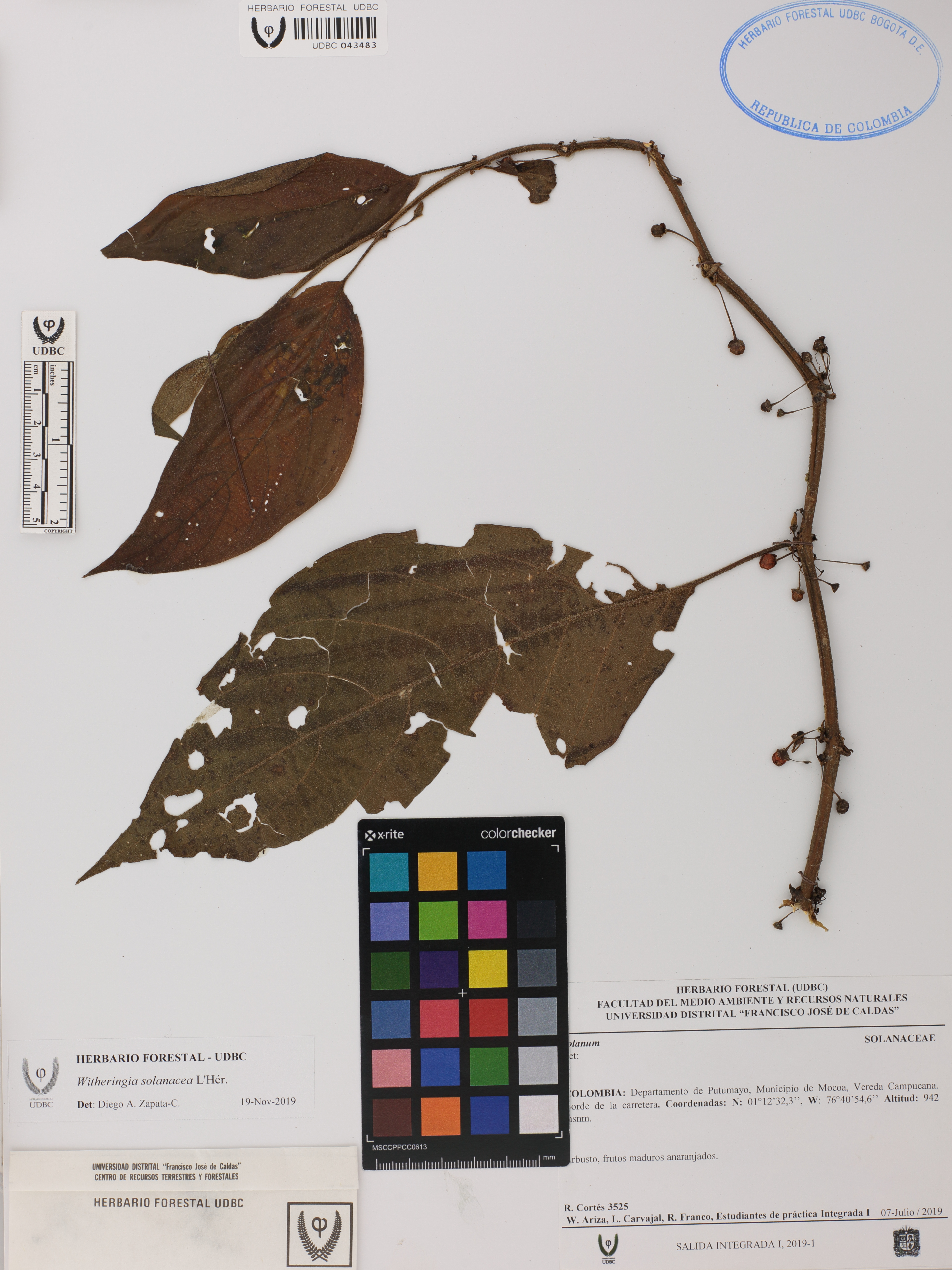 Fotografía del ejemplar Cortés, R. 3525, determinado como Witheringia solanacea en el año 2019