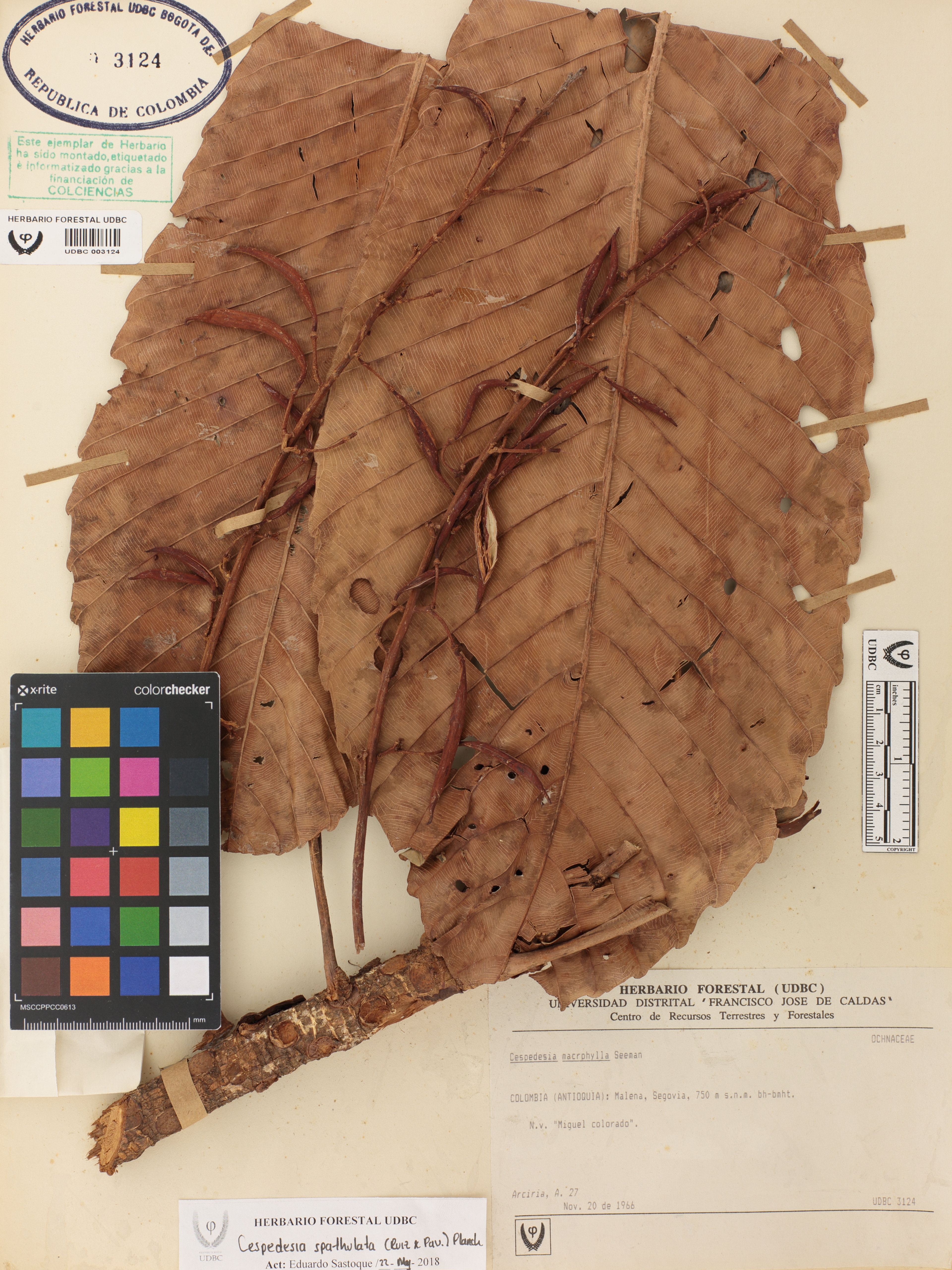Fotografía del ejemplar Arciria, A. 27, determinado como Cespedesia spathulata en el año 1966