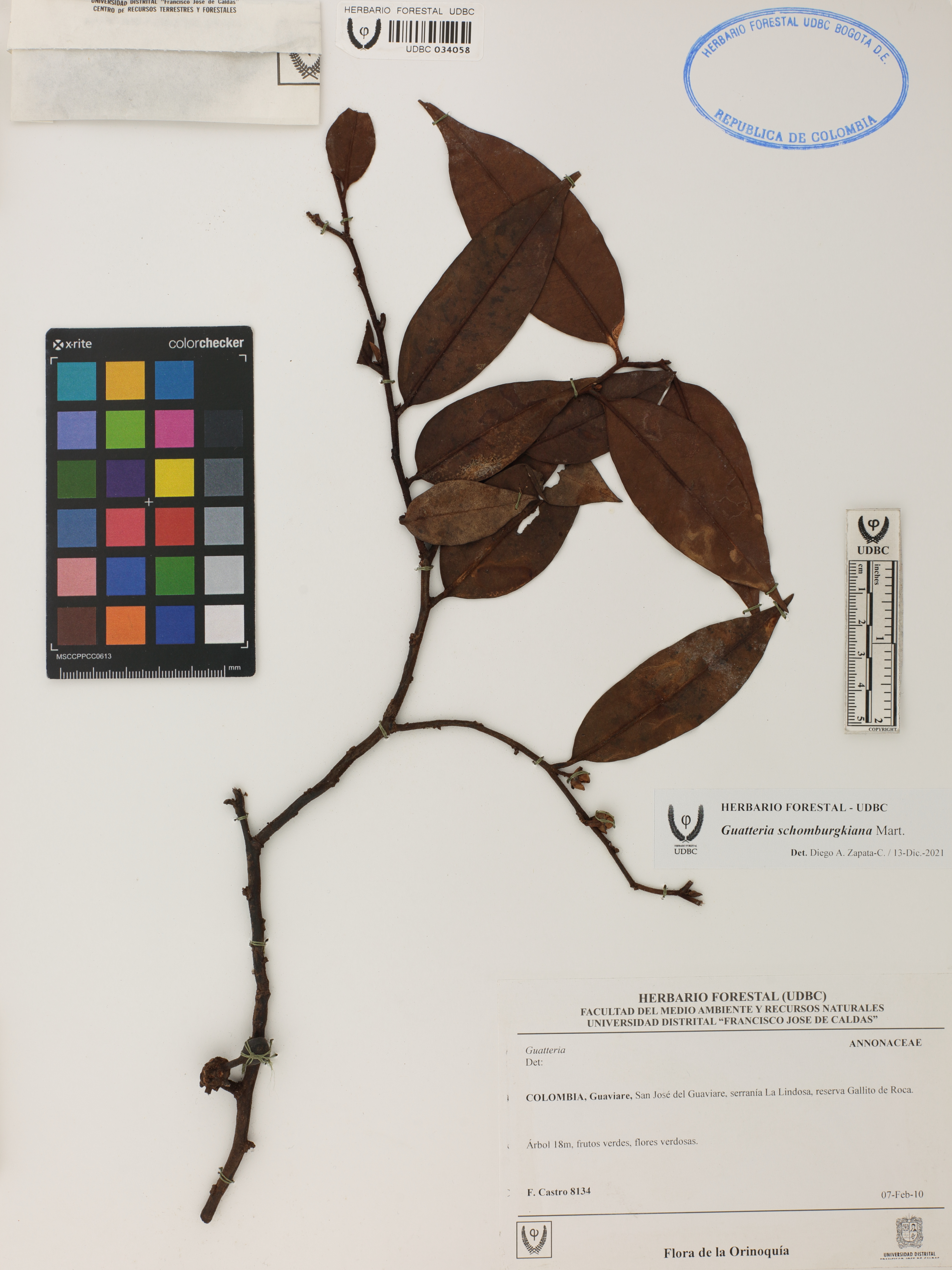 Fotografía del ejemplar Castro, F. 8134, determinado como Guatteria schomburgkiana en el año 2021
