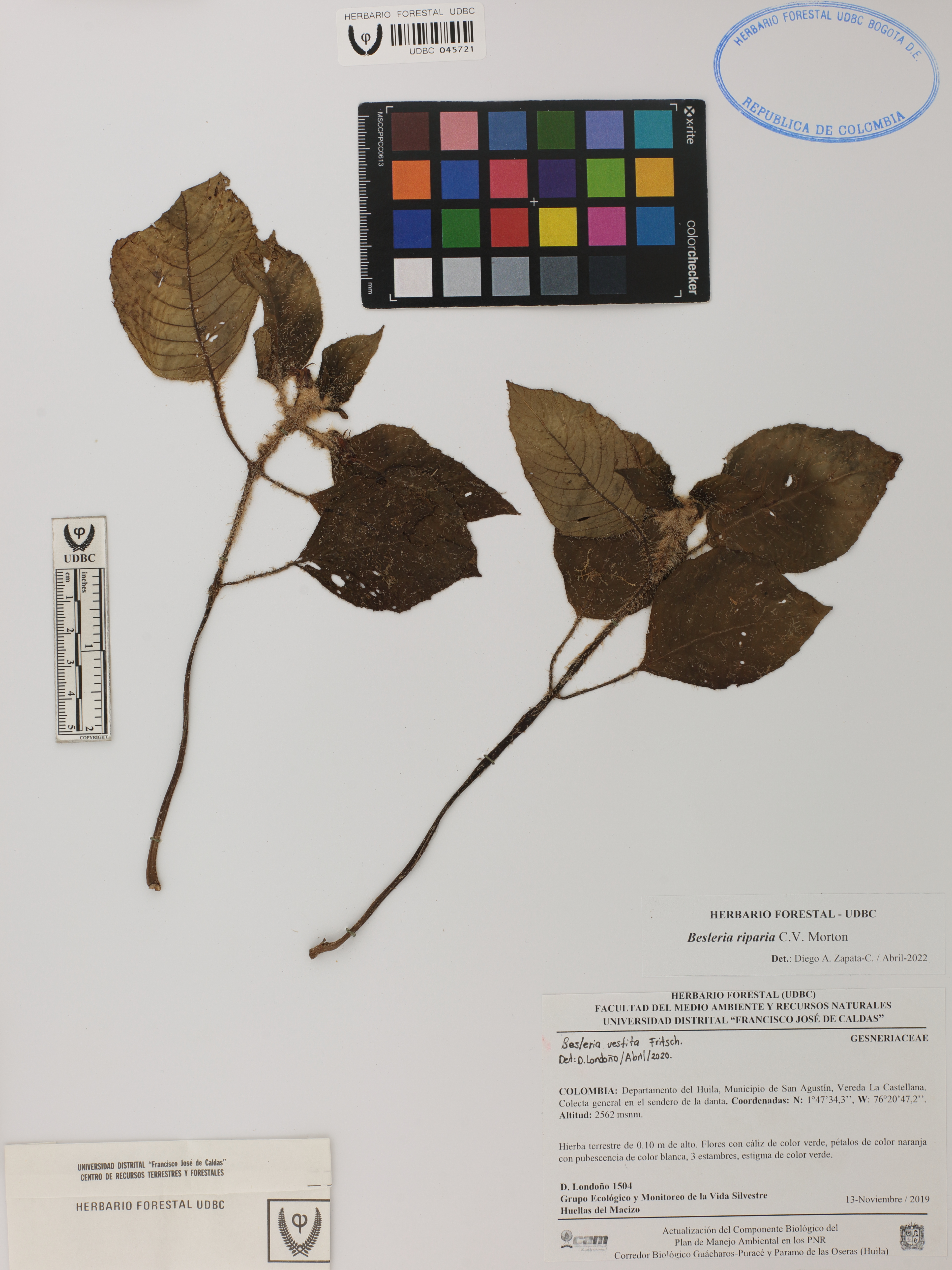 Fotografía del ejemplar Londoño, D. 1504, determinado como Besleria riparia en el año 2022