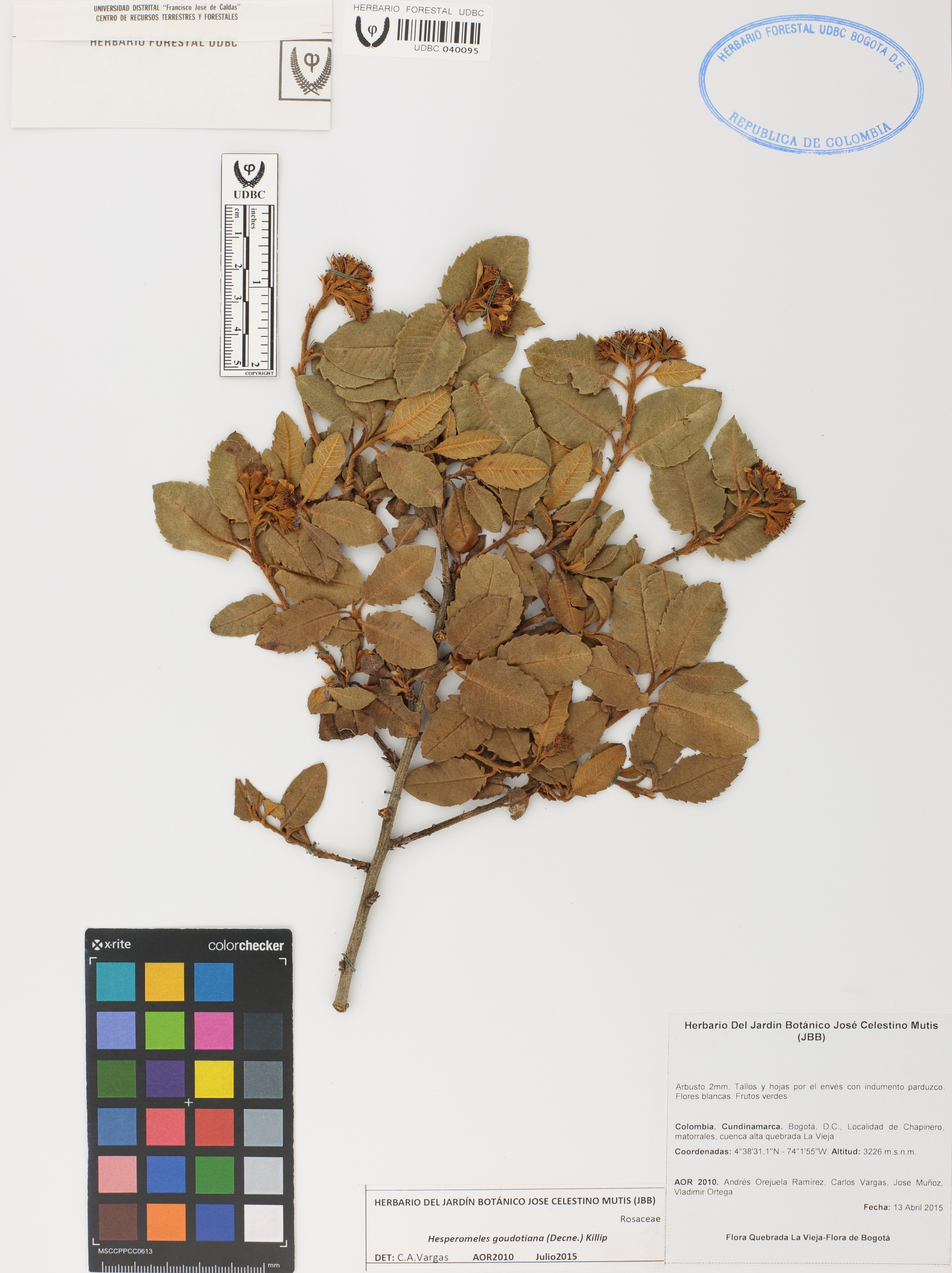 Fotografía del ejemplar Orejuela, A. 2010, determinado como Hesperomeles goudotiana en el año 2015