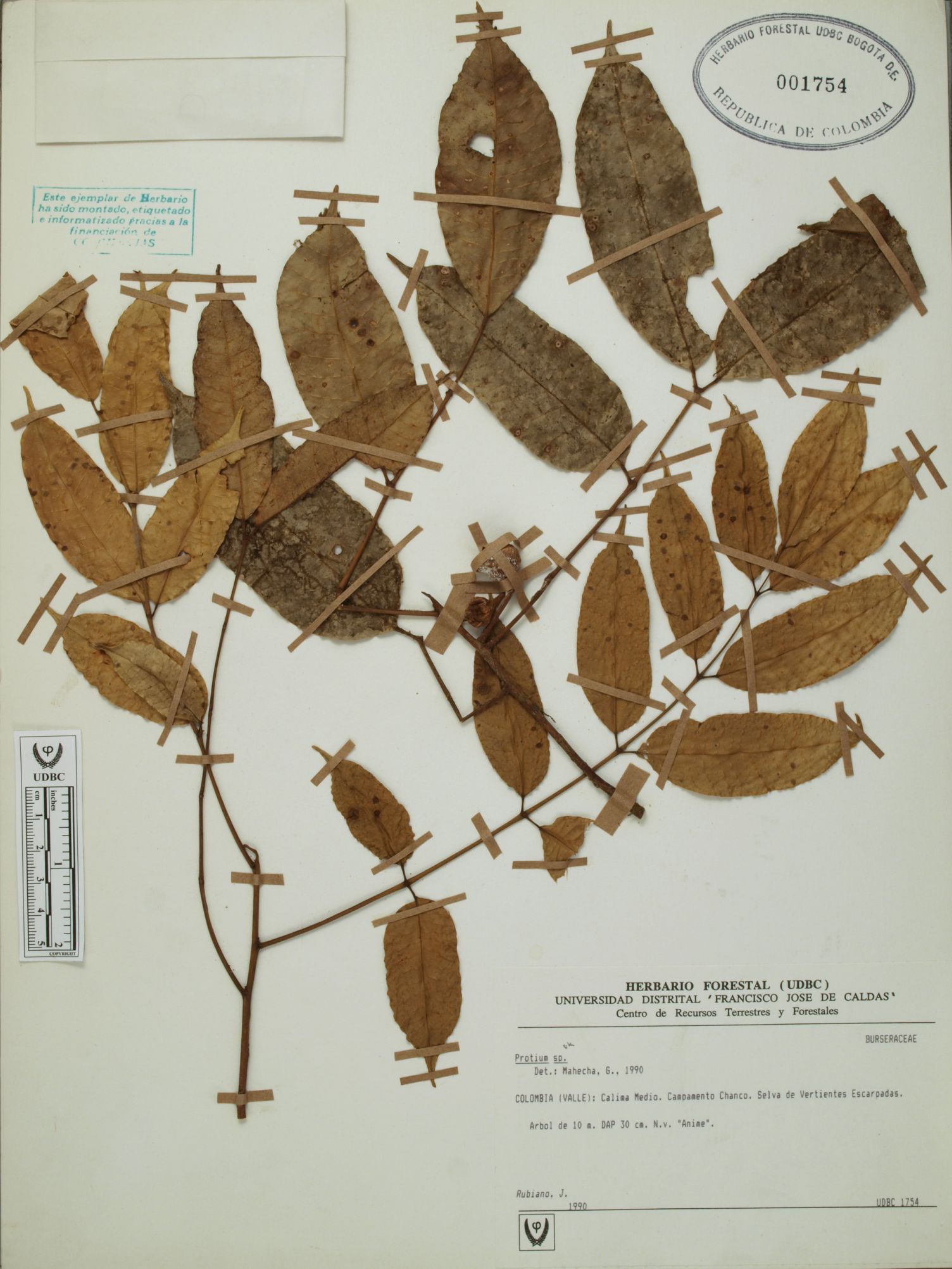 Fotografía del ejemplar Rubiano, J., determinado como Protium sp. en el año 1990