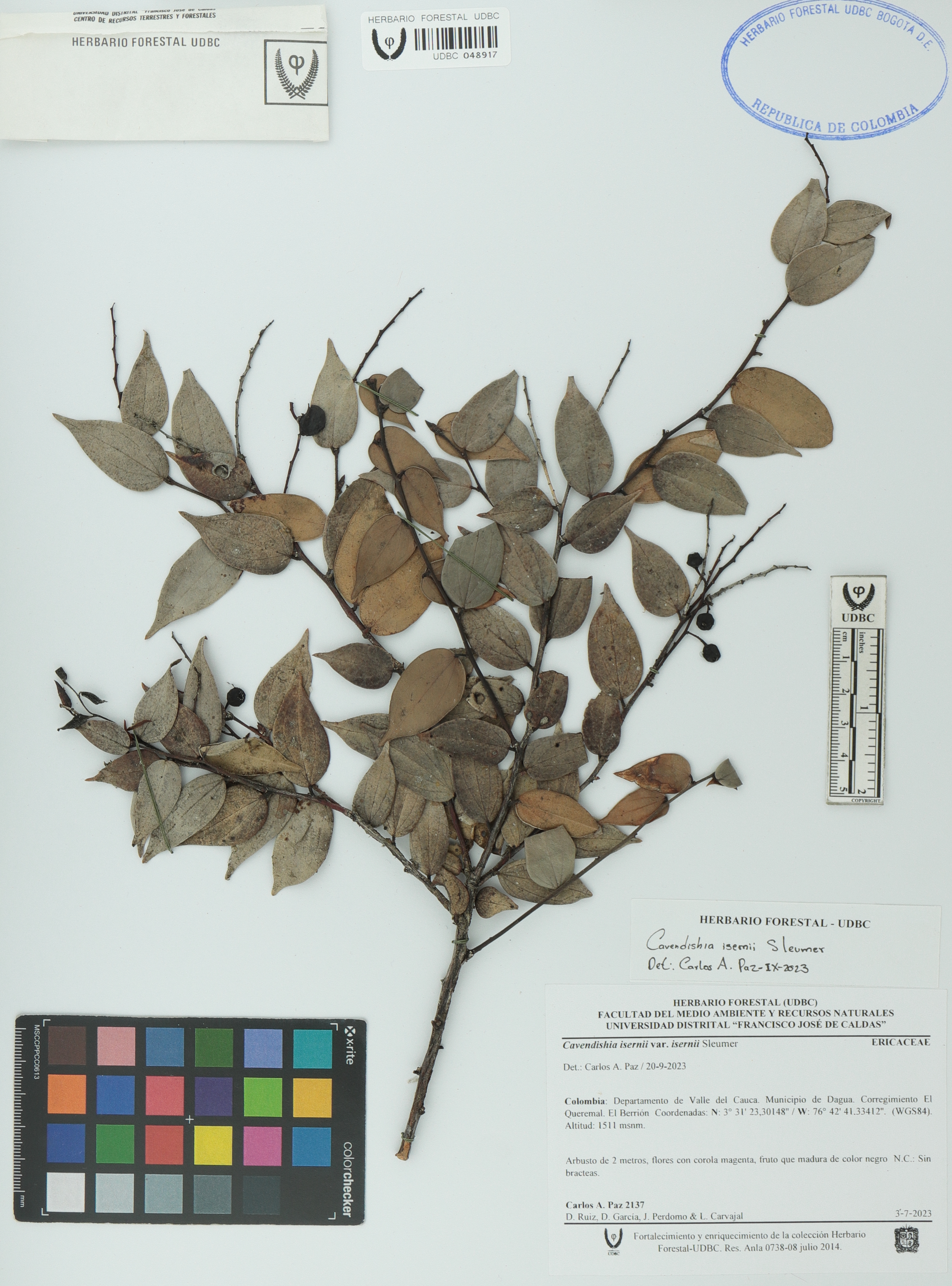 Fotografía del ejemplar Paz, Carlos A. 2137, determinado como Cavendishia isernii en el año 2023