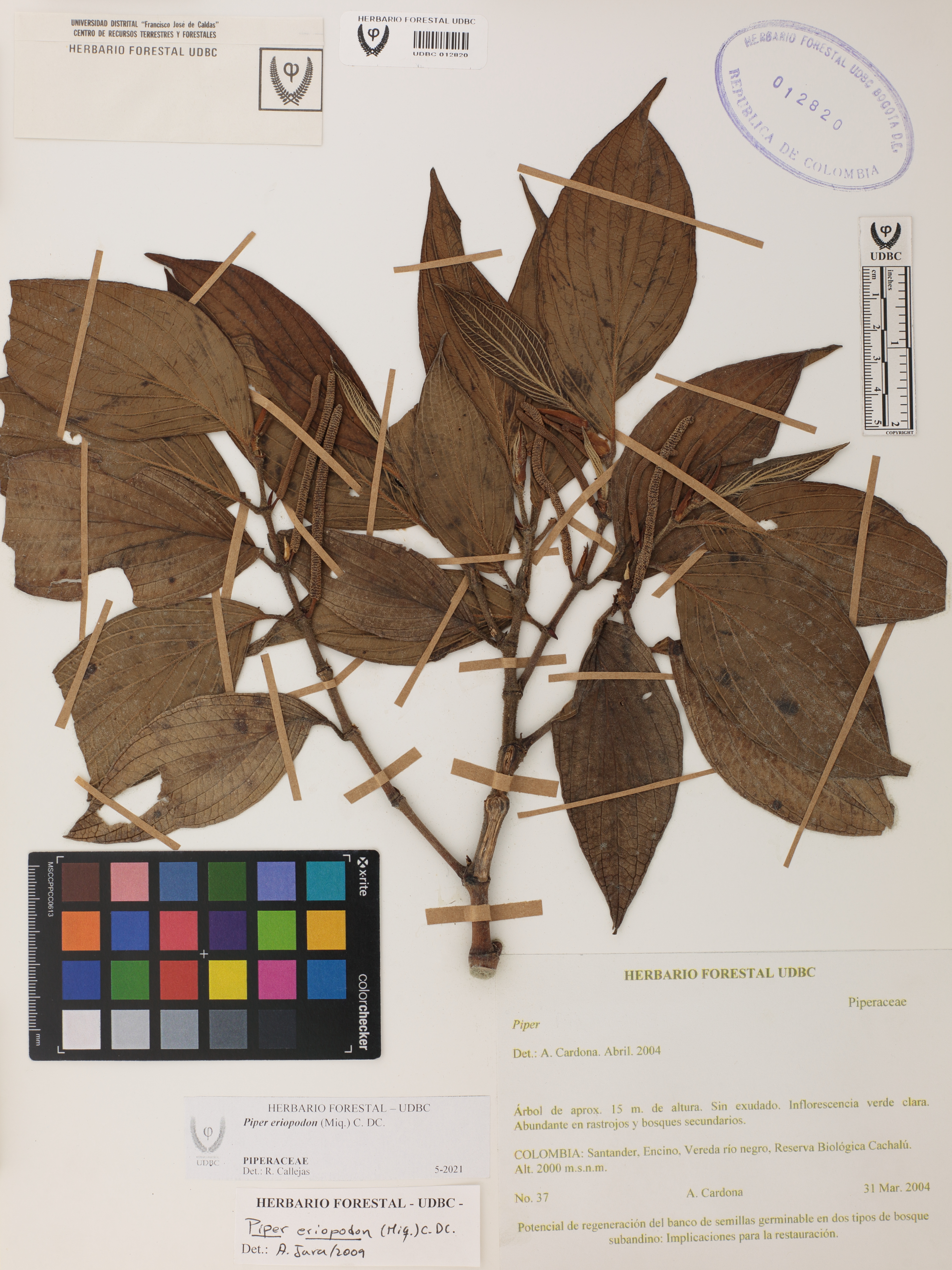 Fotografía del ejemplar Cardona, A. 37, determinado como Piper eriopodon en el año 2021