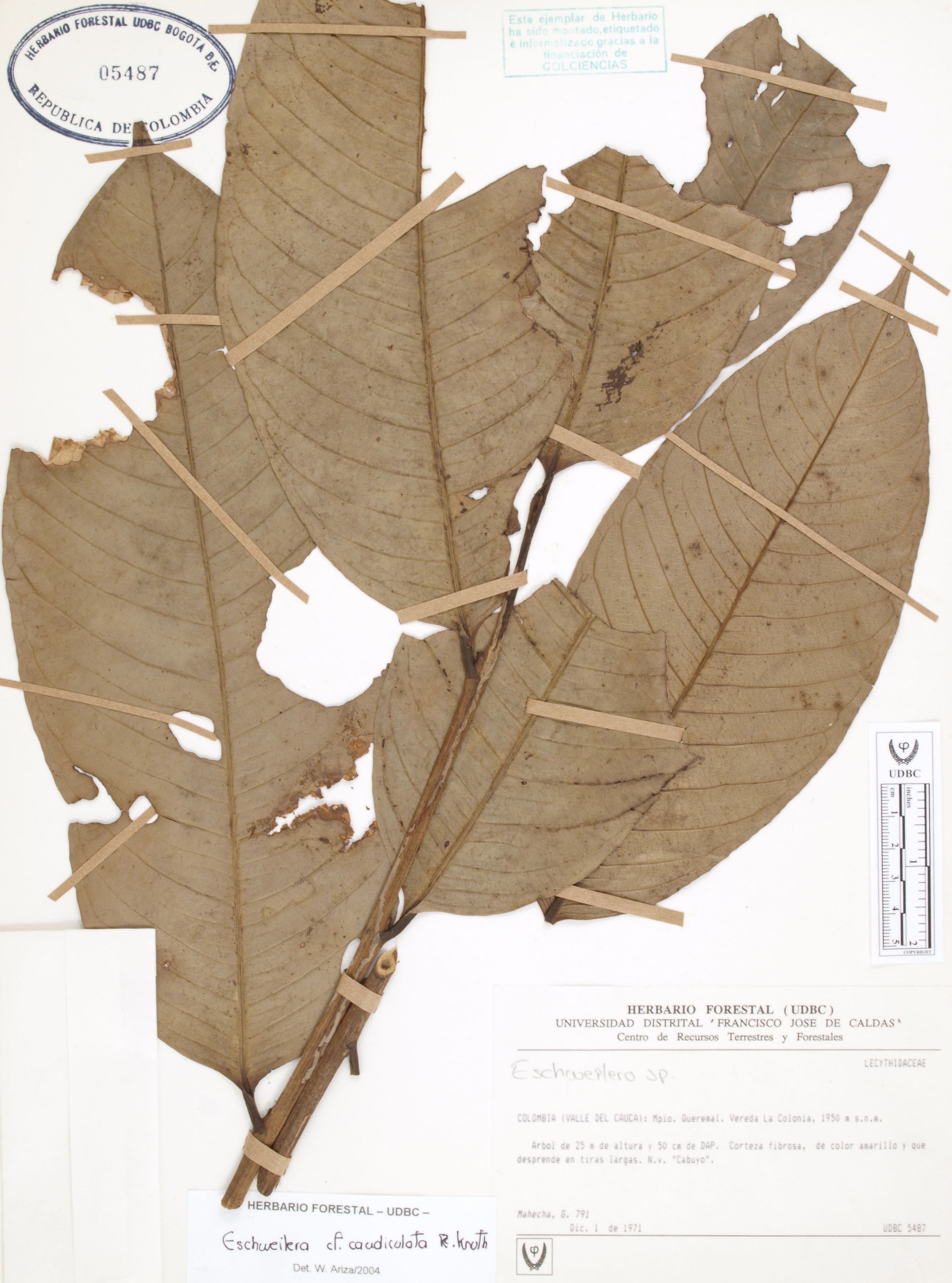Fotografía del ejemplar Mahecha, G. 791, determinado como Eschweilera caudiculata en el año 2004