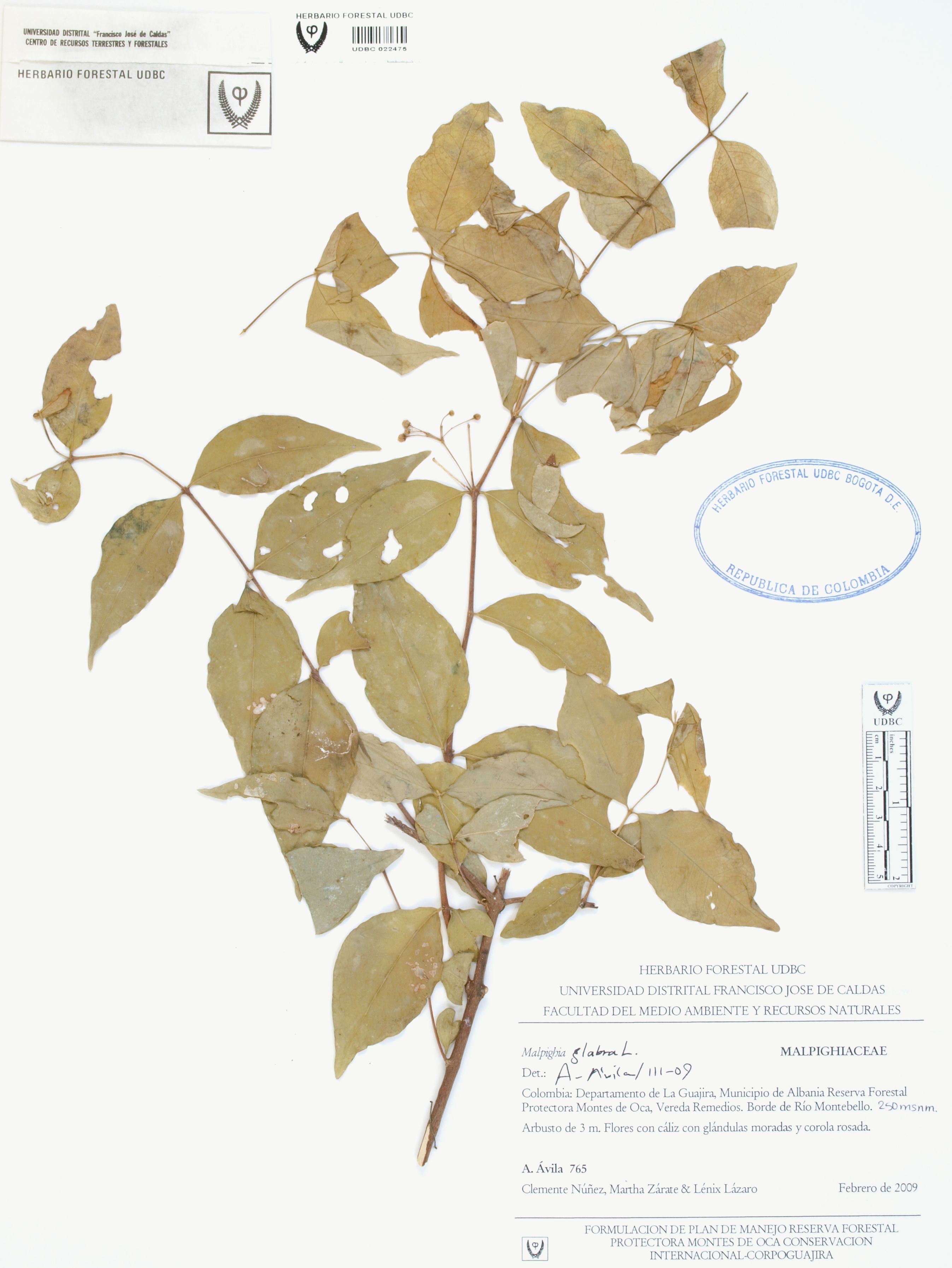 Fotografía del ejemplar Ávila, F. 765, determinado como Malpighia glabra en el año 2009