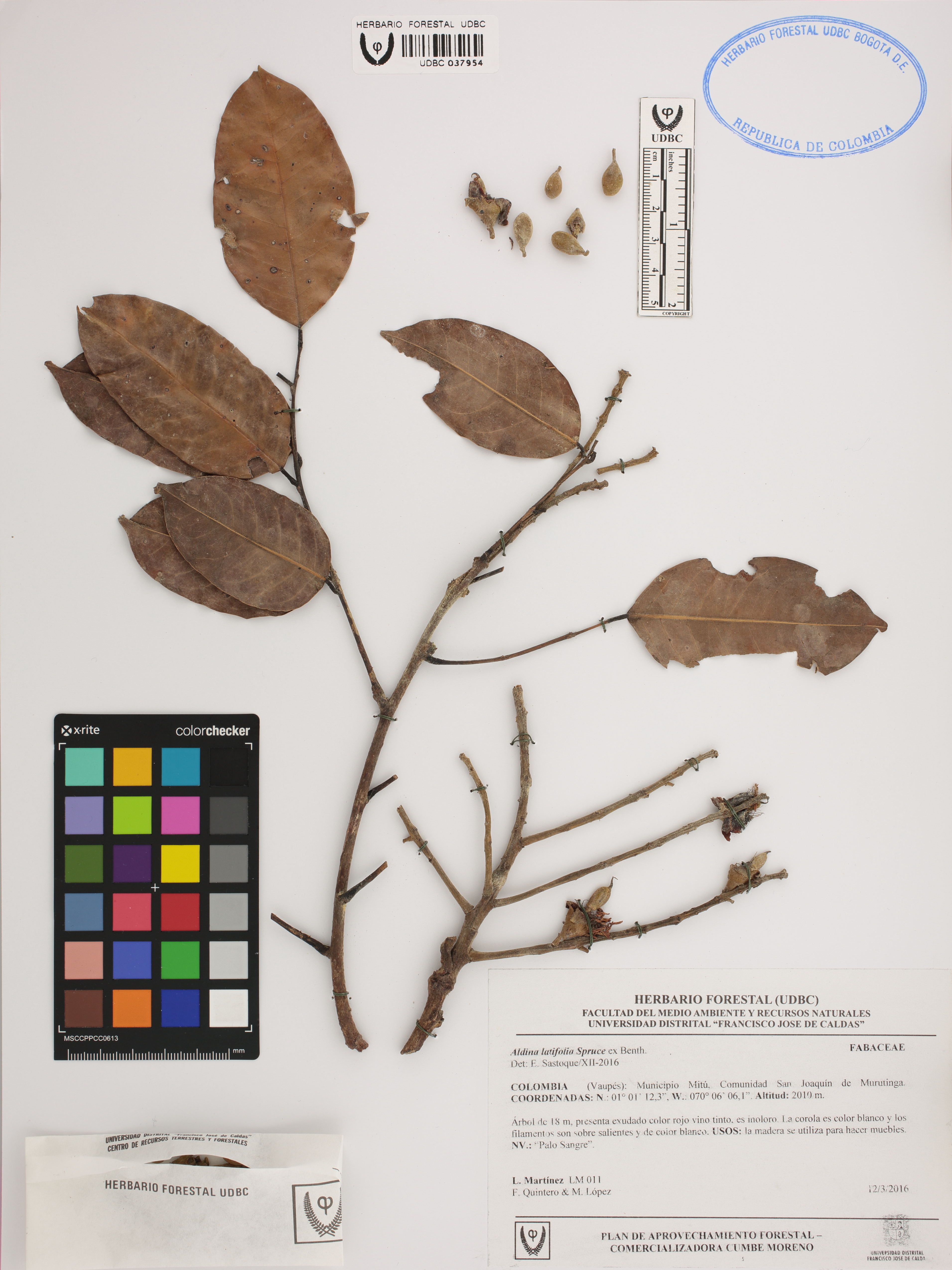 Fotografía del ejemplar Martínez, L. 11, determinado como Aldina latifolia en el año 2016
