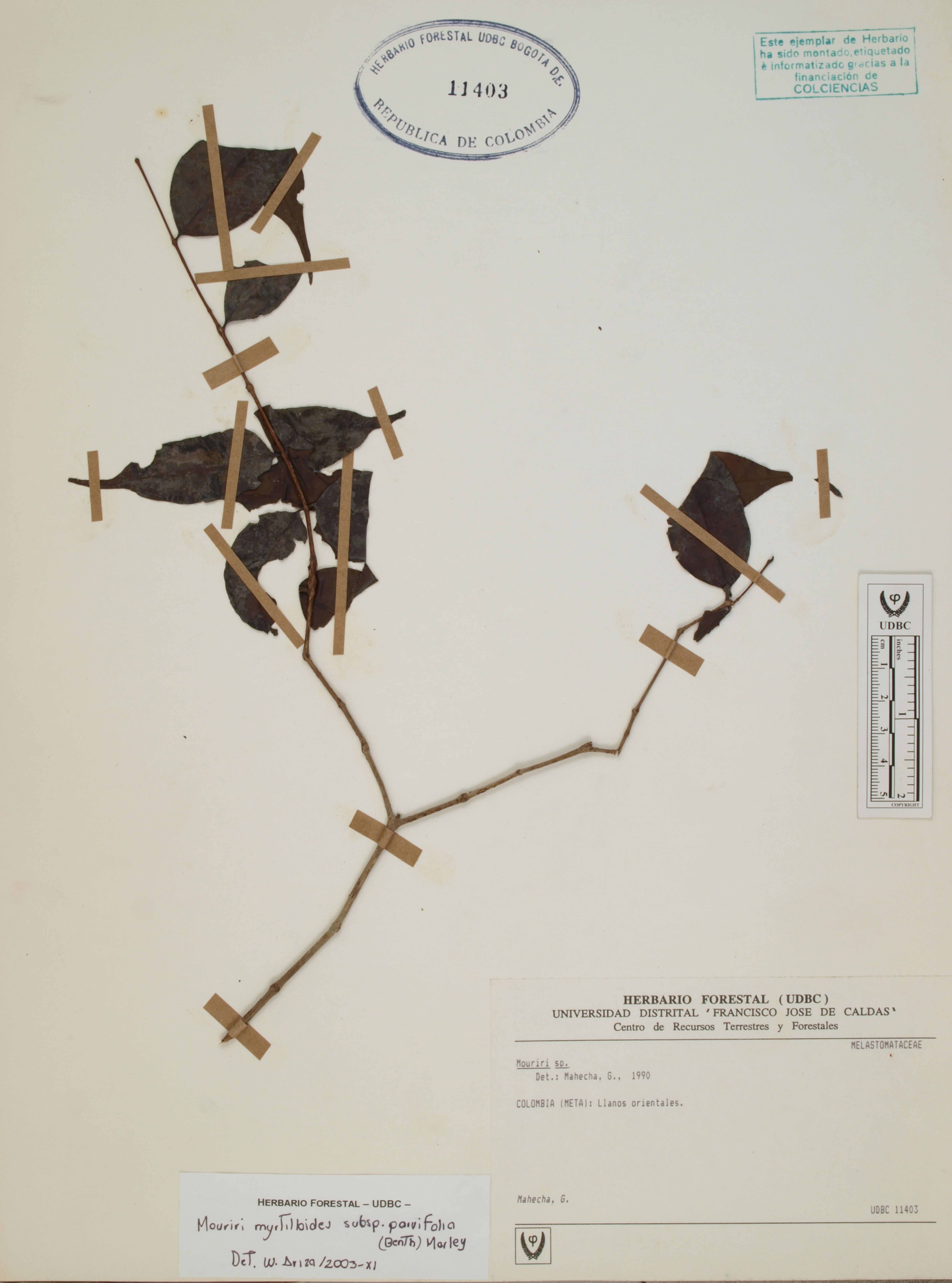 Fotografía del ejemplar Mahecha, G., determinado como Mouriri myrtilloides subsp. parvifolia en el año 2003