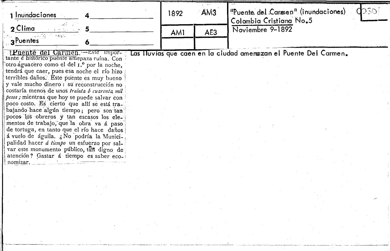 The Imagine presents a news Item About: "The rains that fall in the city threaten the Puente del Carmen" Published in the Colombia Cristiana Newspaper No.05, November 9, 1892