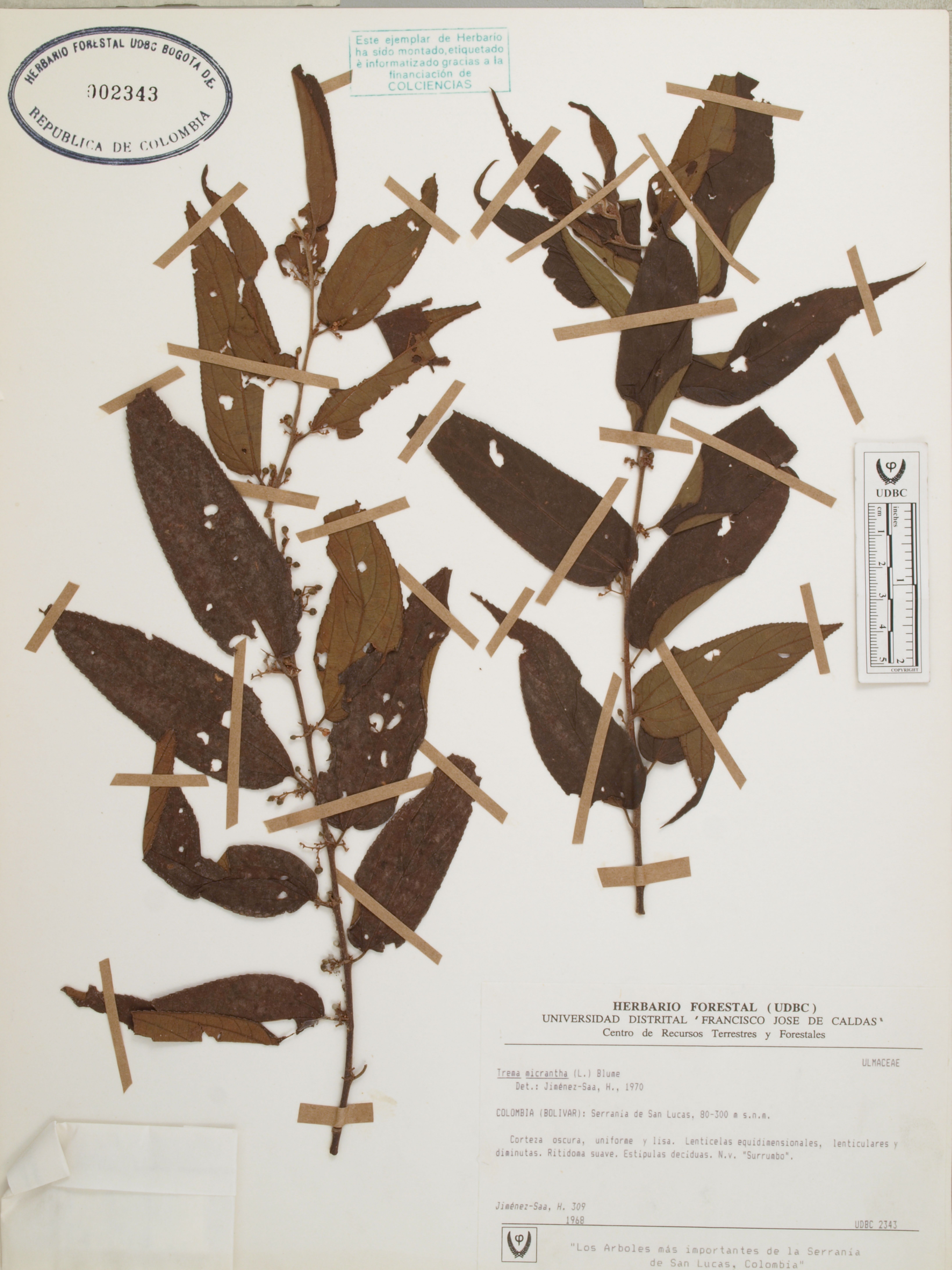 Fotografía del ejemplar Jiménez-Saa, H. 309, determinado como Trema micranthum en el año 1970