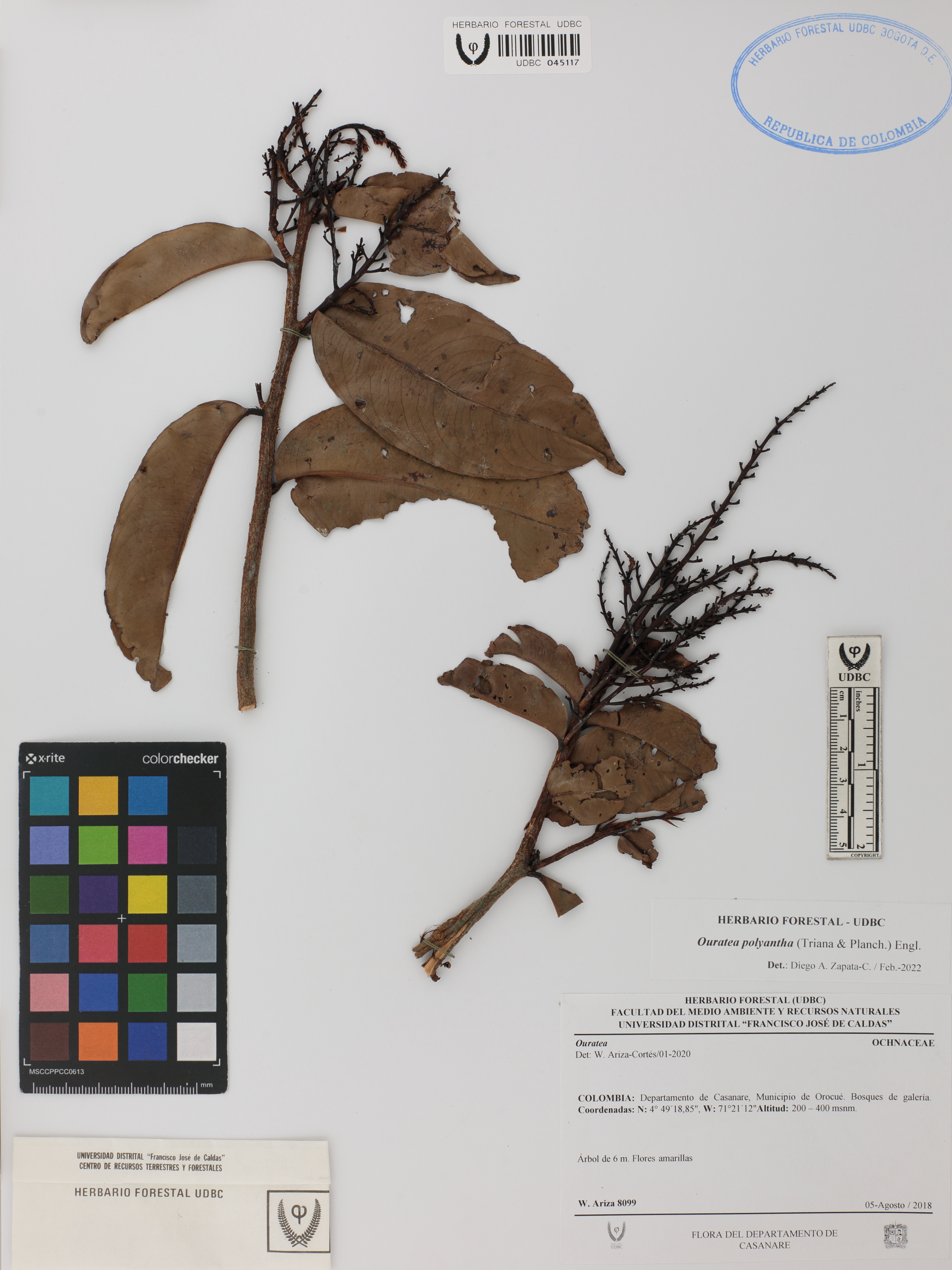Fotografía del ejemplar Ariza-Cortés, W. 8099, determinado como Ouratea polyantha en el año 2022