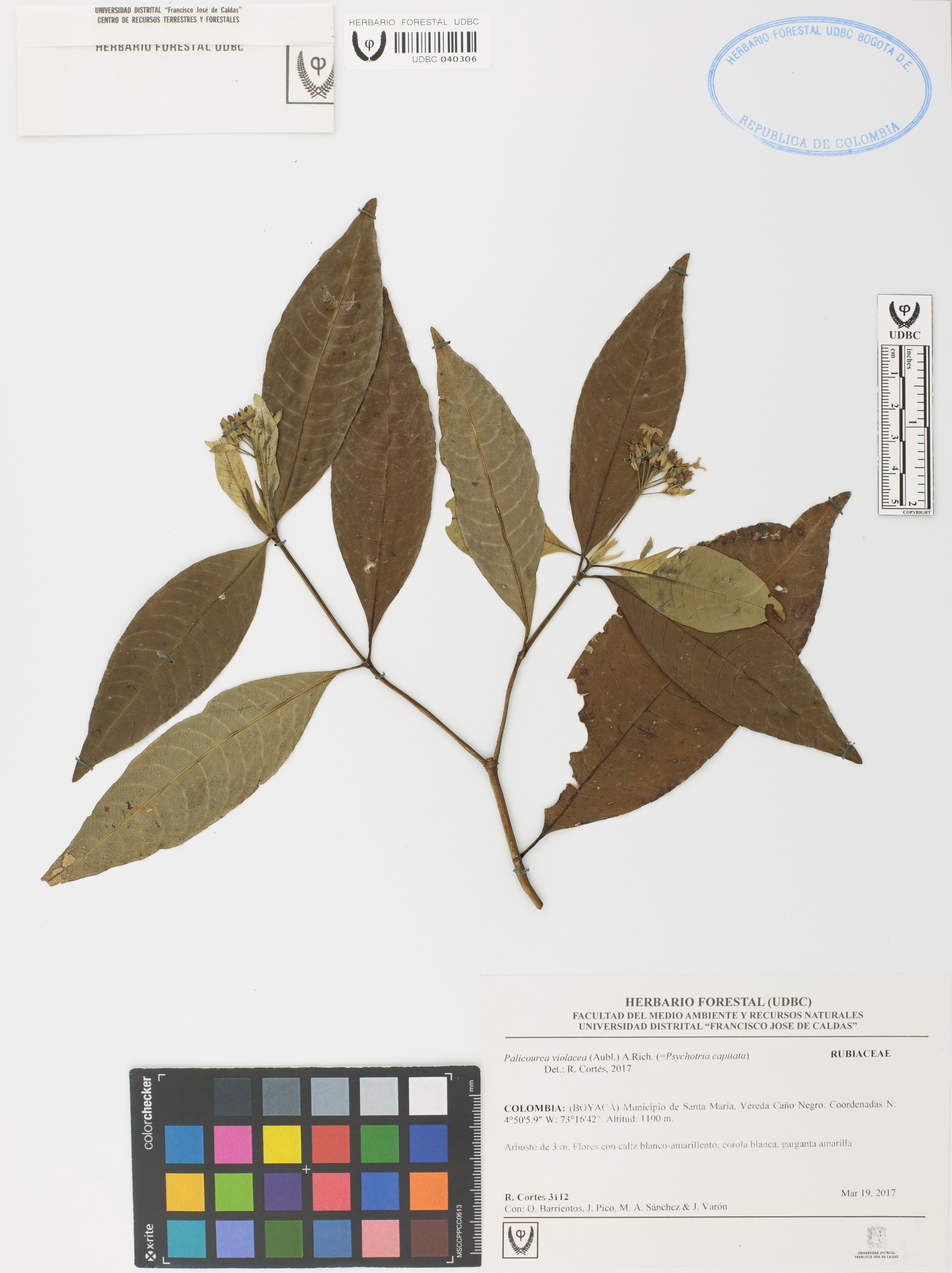 Fotografía del ejemplar Cortés, R. 3112, determinado como Palicourea violacea en el año 2017