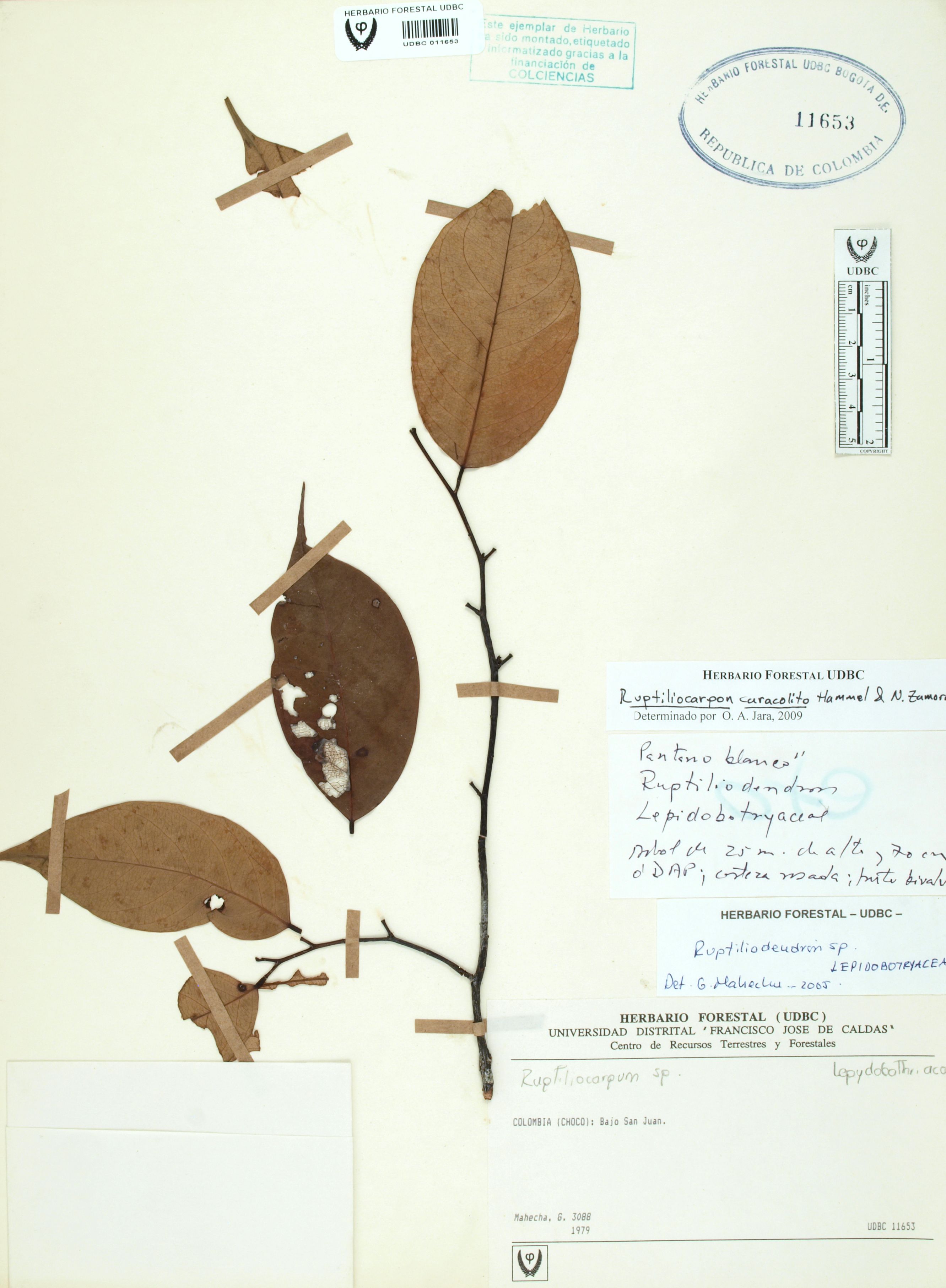 Fotografía del ejemplar Mahecha, G. 3088, determinado como Ruptiliocarpon caracolito en el año 2009