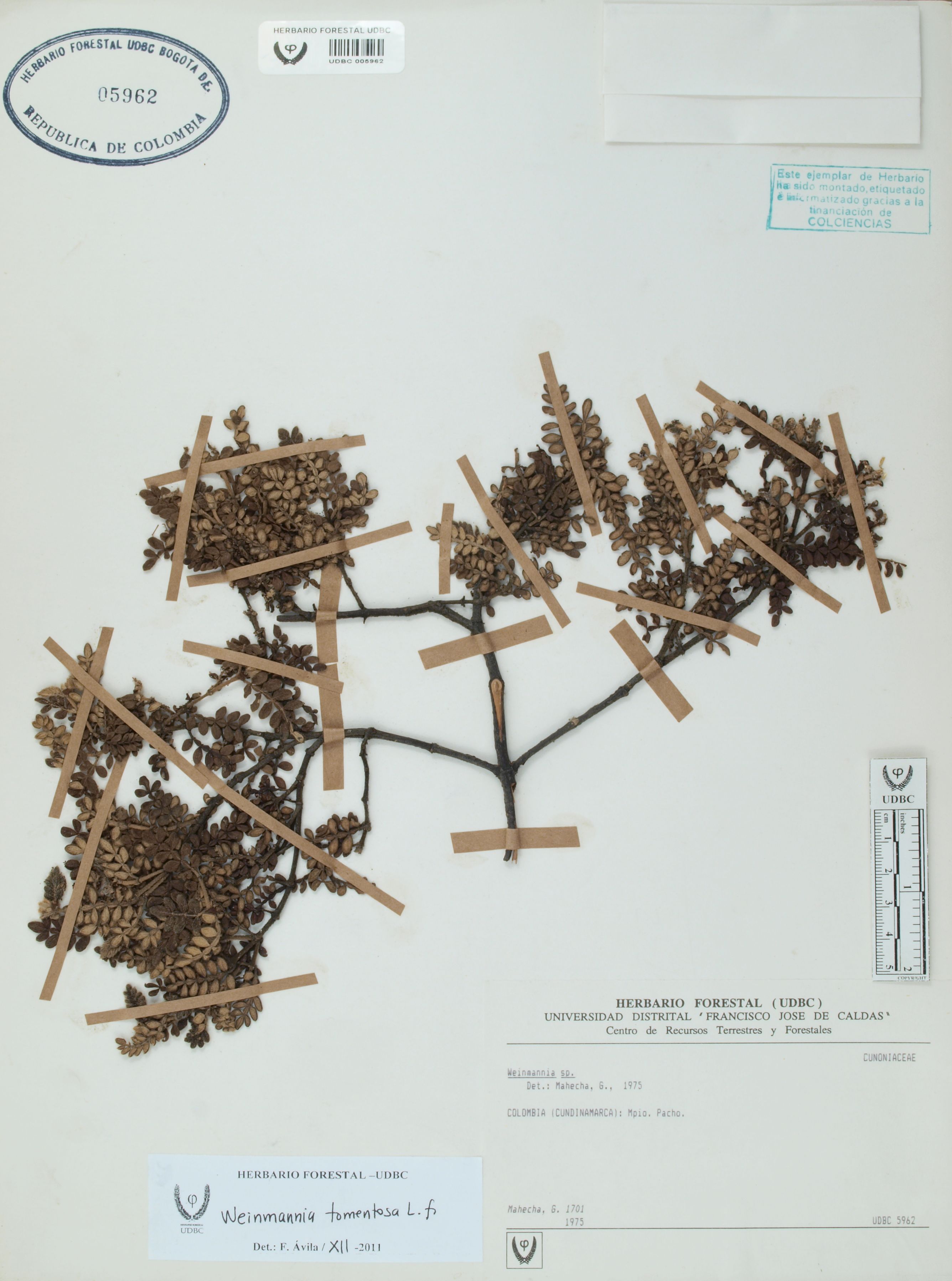 Fotografía del ejemplar Mahecha, G. 1701, determinado como Weinmannia tomentosa en el año 2011
