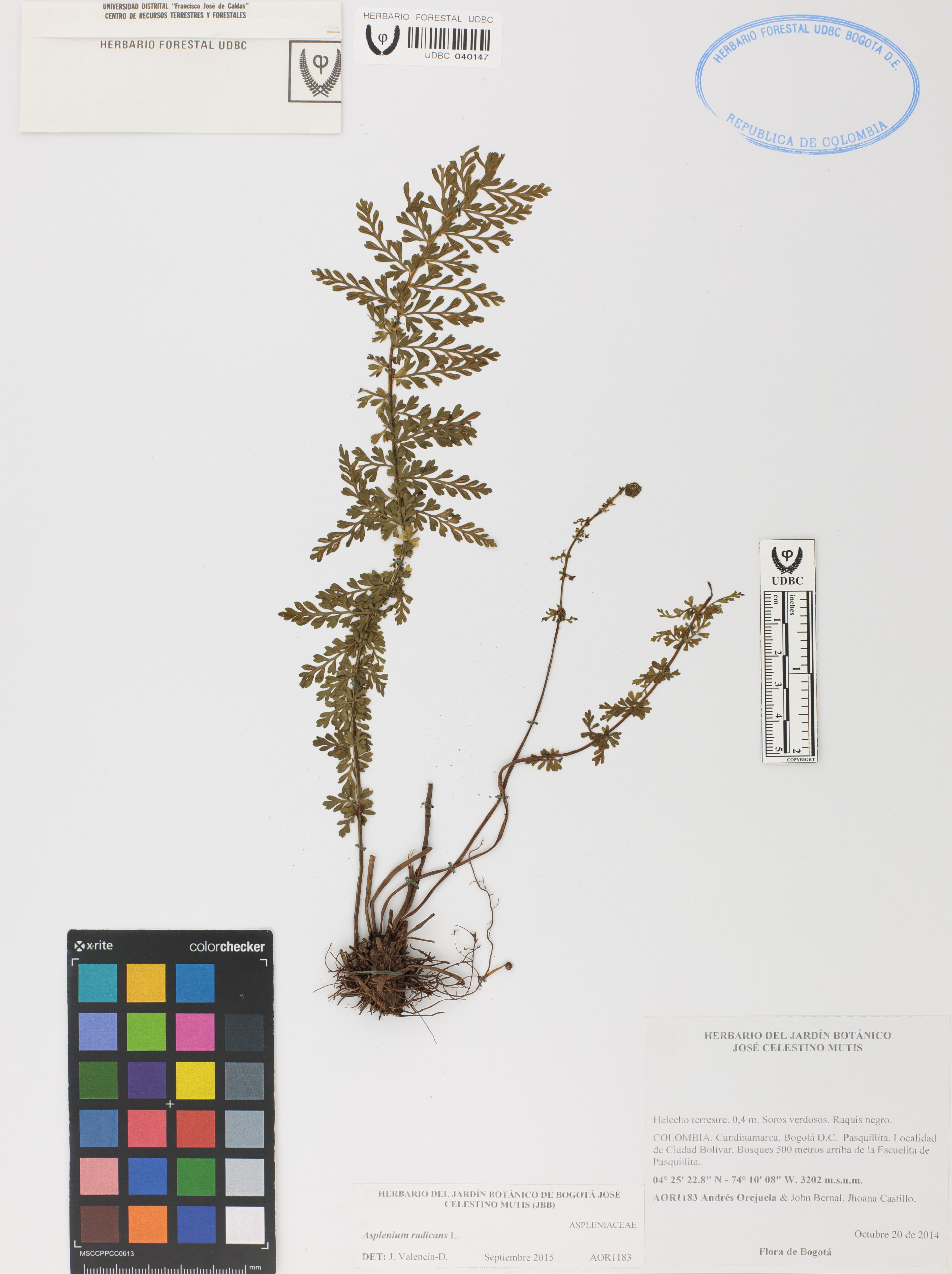 Fotografía del ejemplar Orejuela, A. 1183, determinado como Asplenium radicans en el año 2015