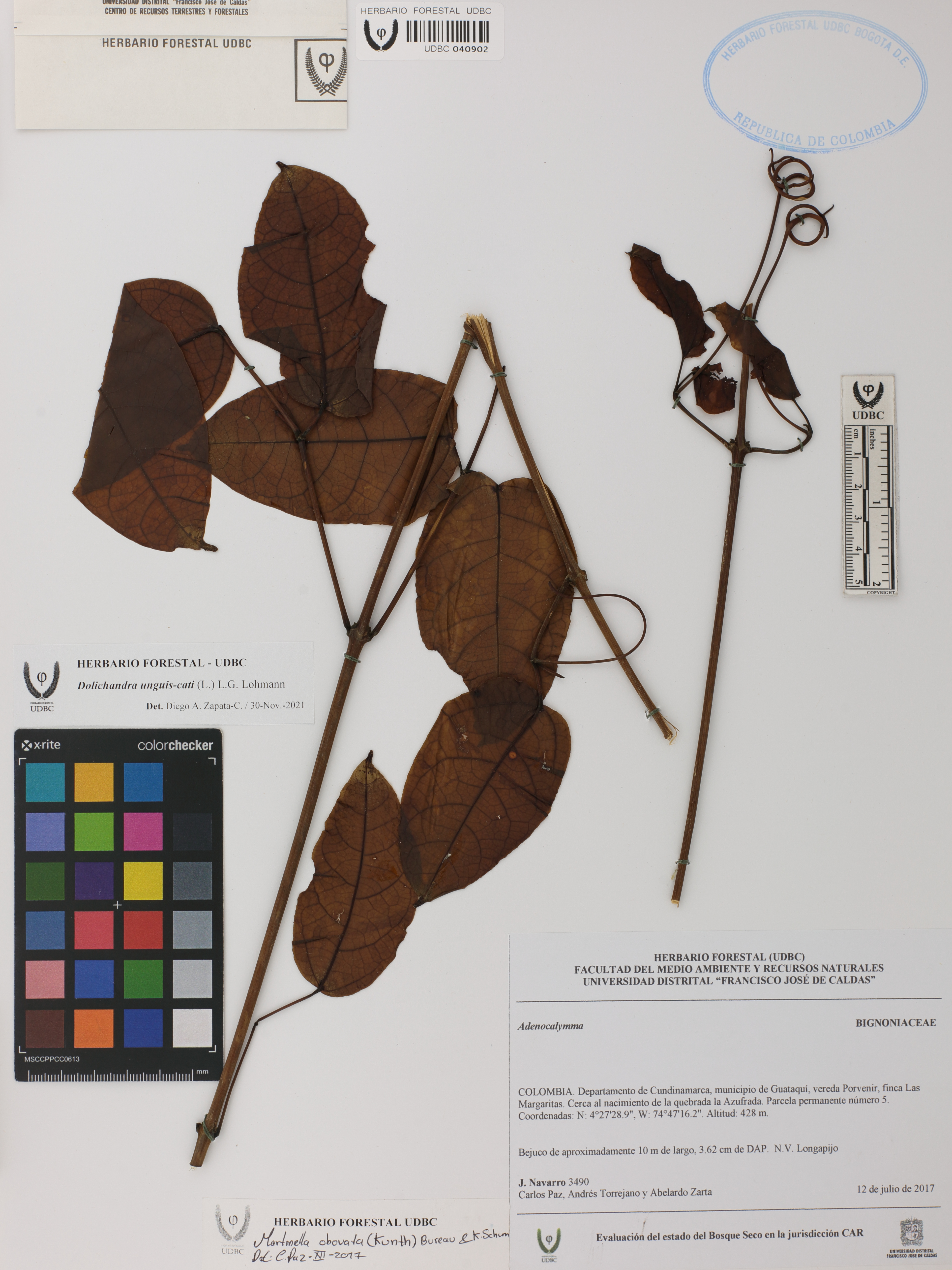| dc.description | Fotografía del ejemplar Navarro, J. 3490, determinado como Dolichandra unguis-cati en el año 2021 | |