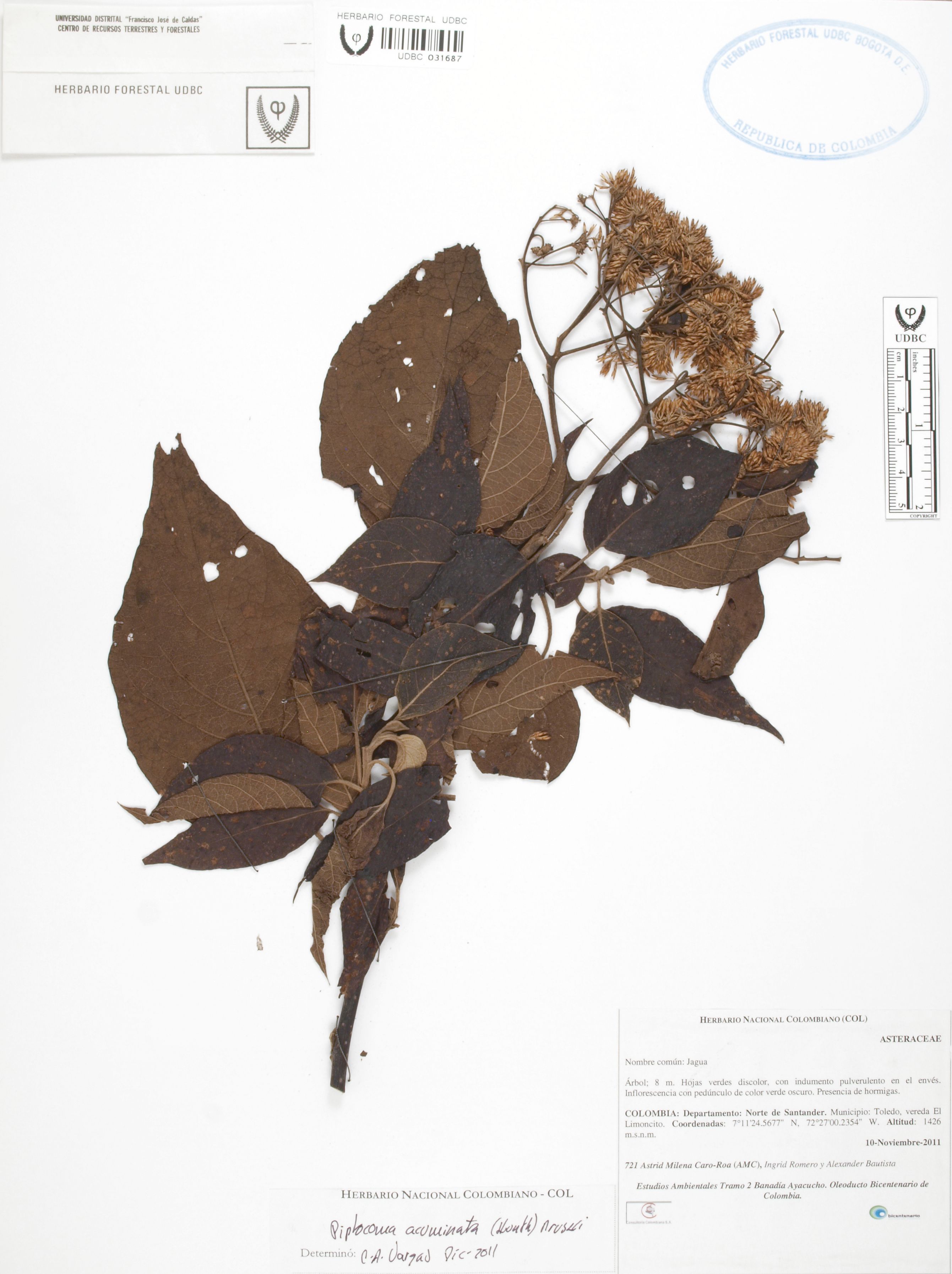 Fotografía del ejemplar Caro-Roa, A. 721, determinado como Piptocoma acuminata en el año 2011
