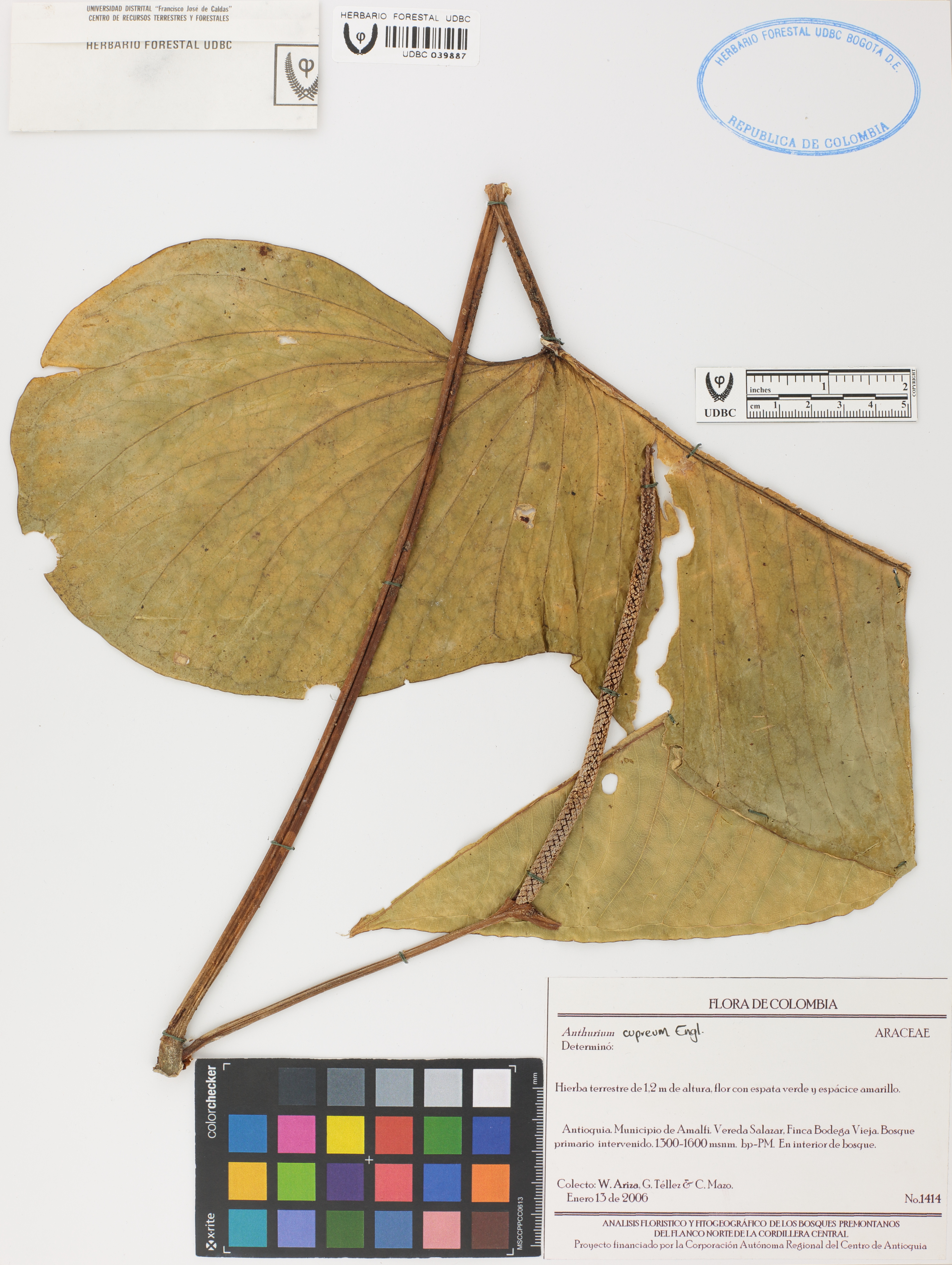 Fotografía del ejemplar Ariza, W. 1414, determinado como Anthurium cupreum
