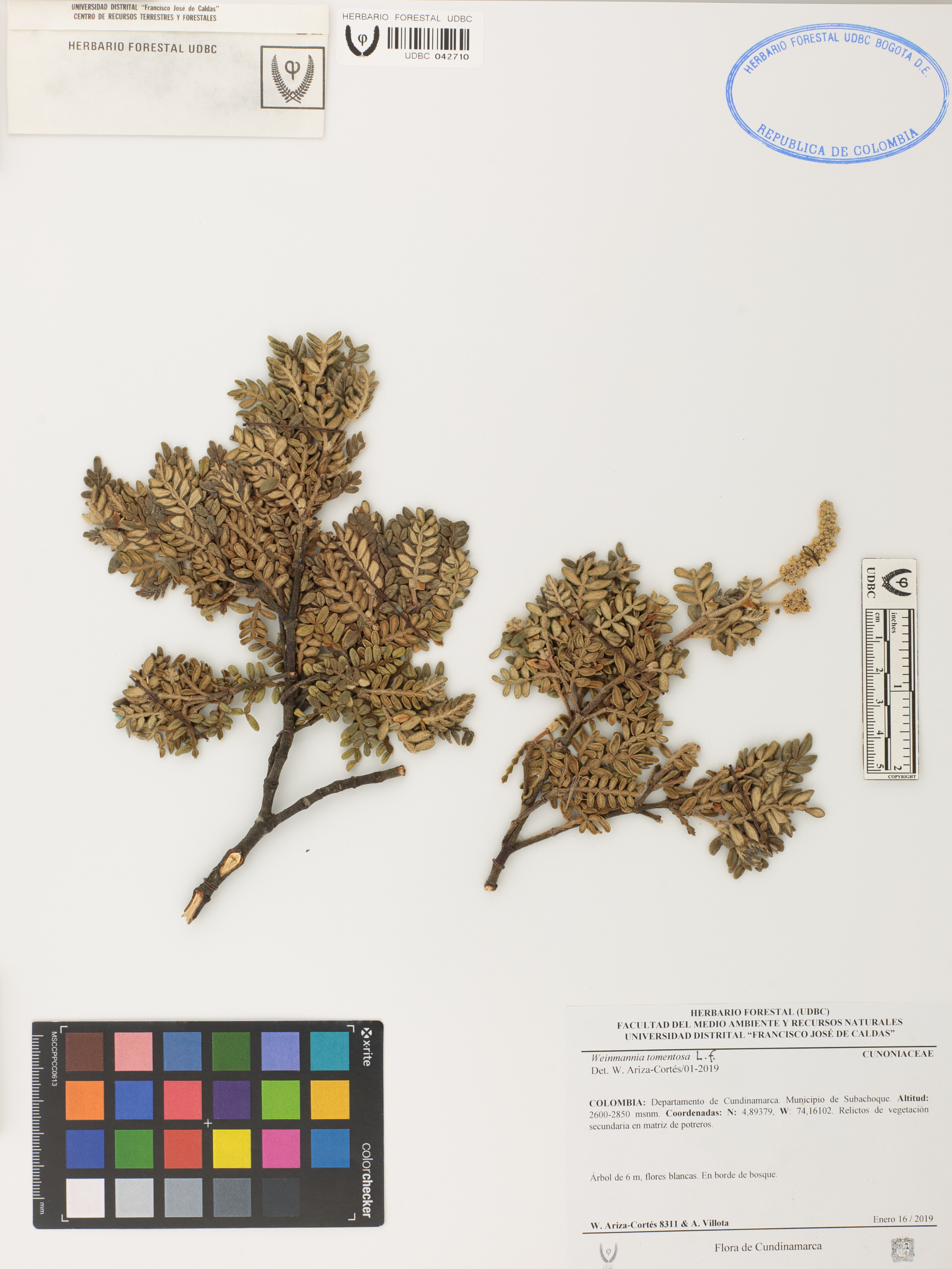 Fotografía del ejemplar Ariza-C., W. 8311, determinado como Weinmannia tomentosa en el año 2019