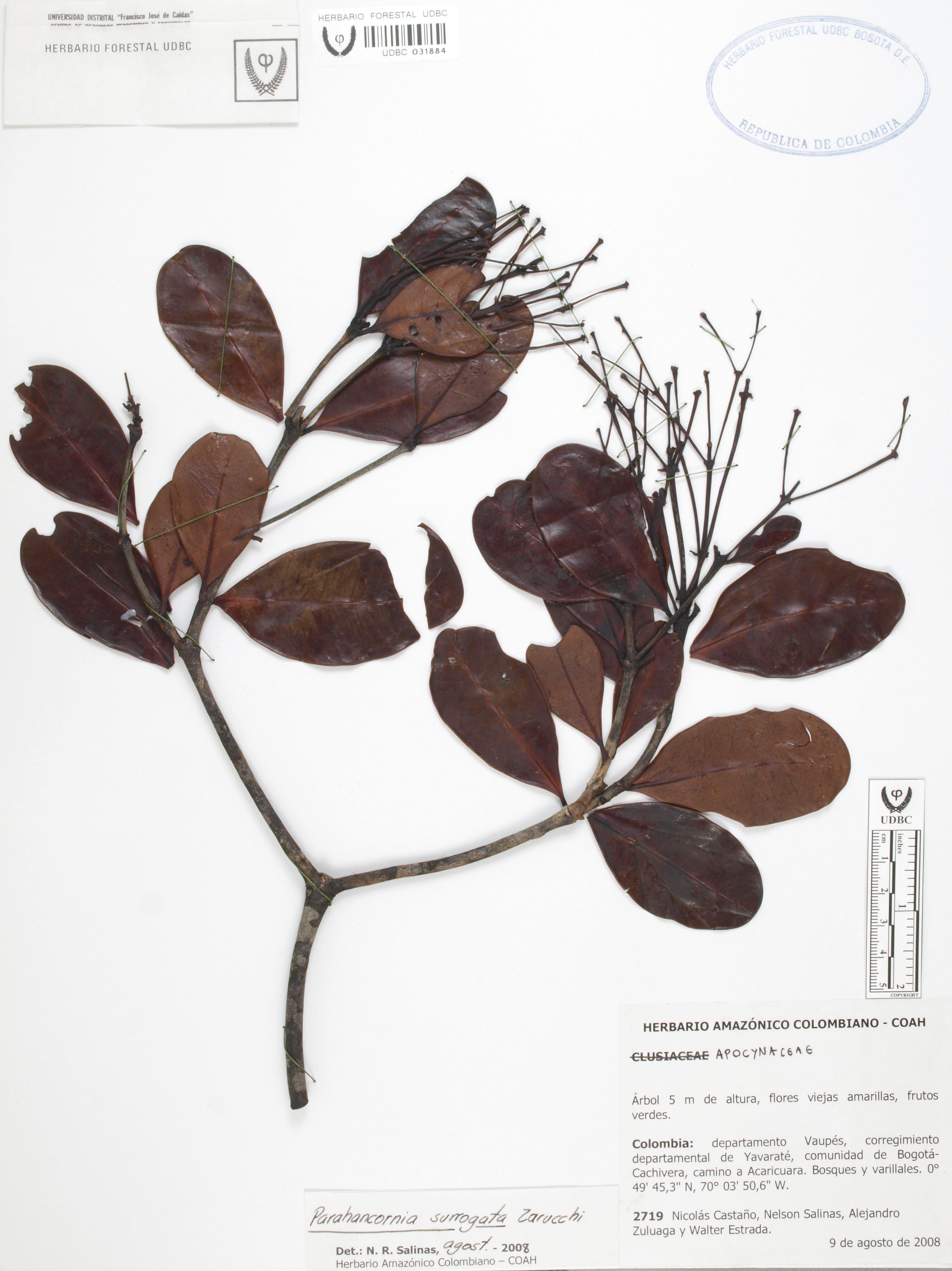 Fotografía del ejemplar Castaño, N. 2719, determinado como Parahancornia surrogata en el año 2008