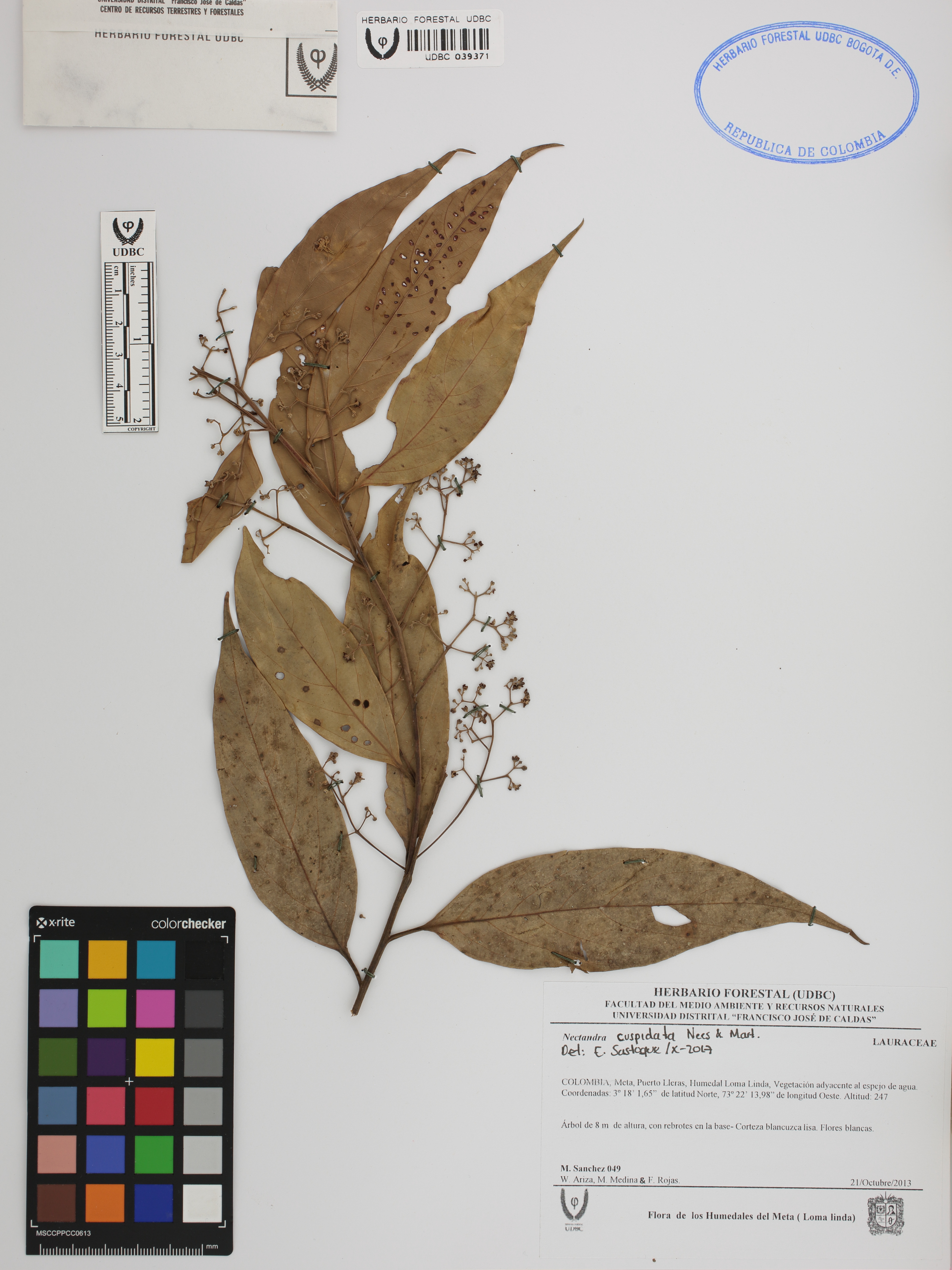 Fotografía del ejemplar Sánchez, M. 49, determinado como Nectandra cuspidata en el año 2017
