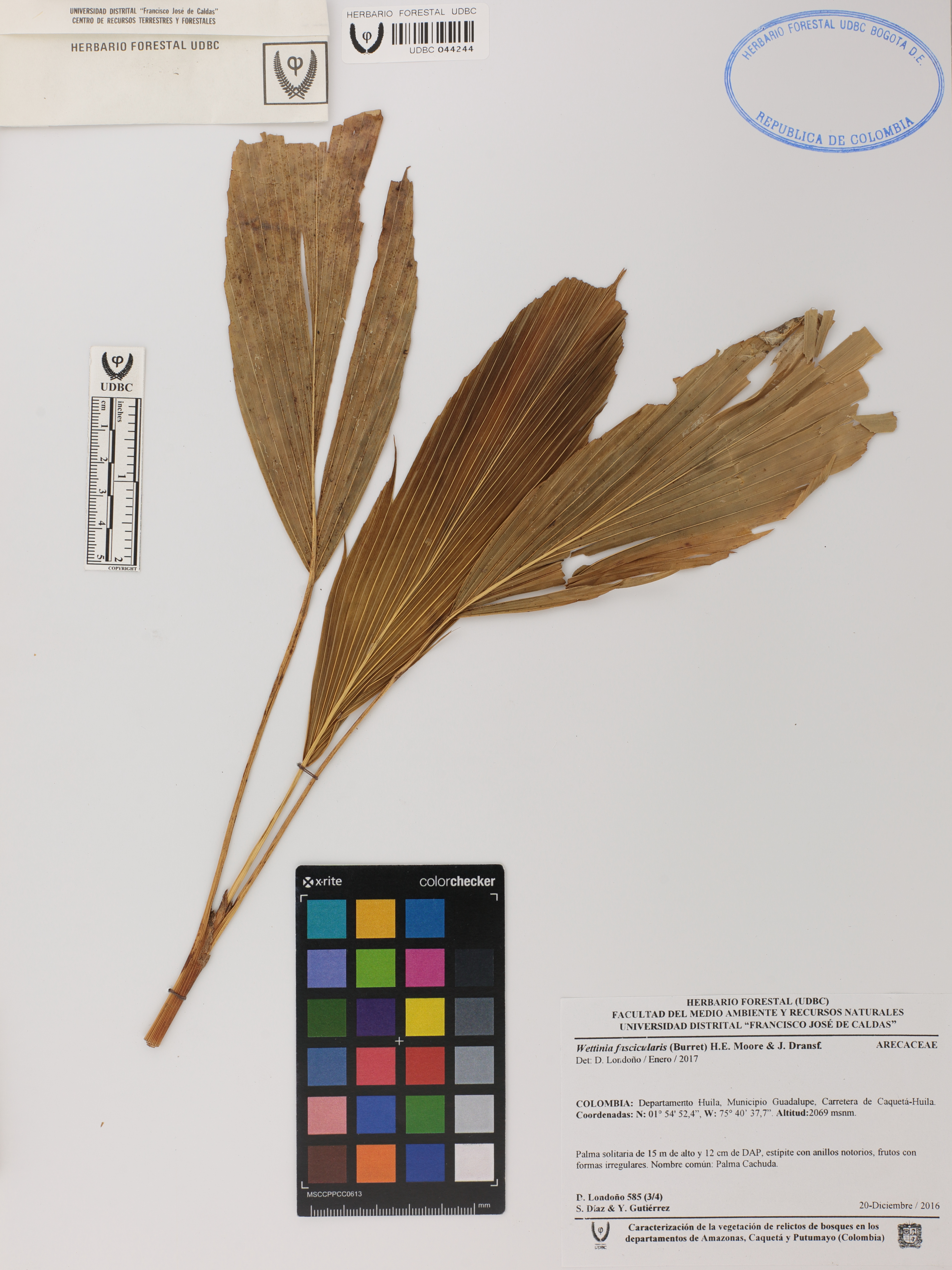 Fotografía del ejemplar Londoño, D. 585, determinado como Wettinia fascicularis en el año 2017