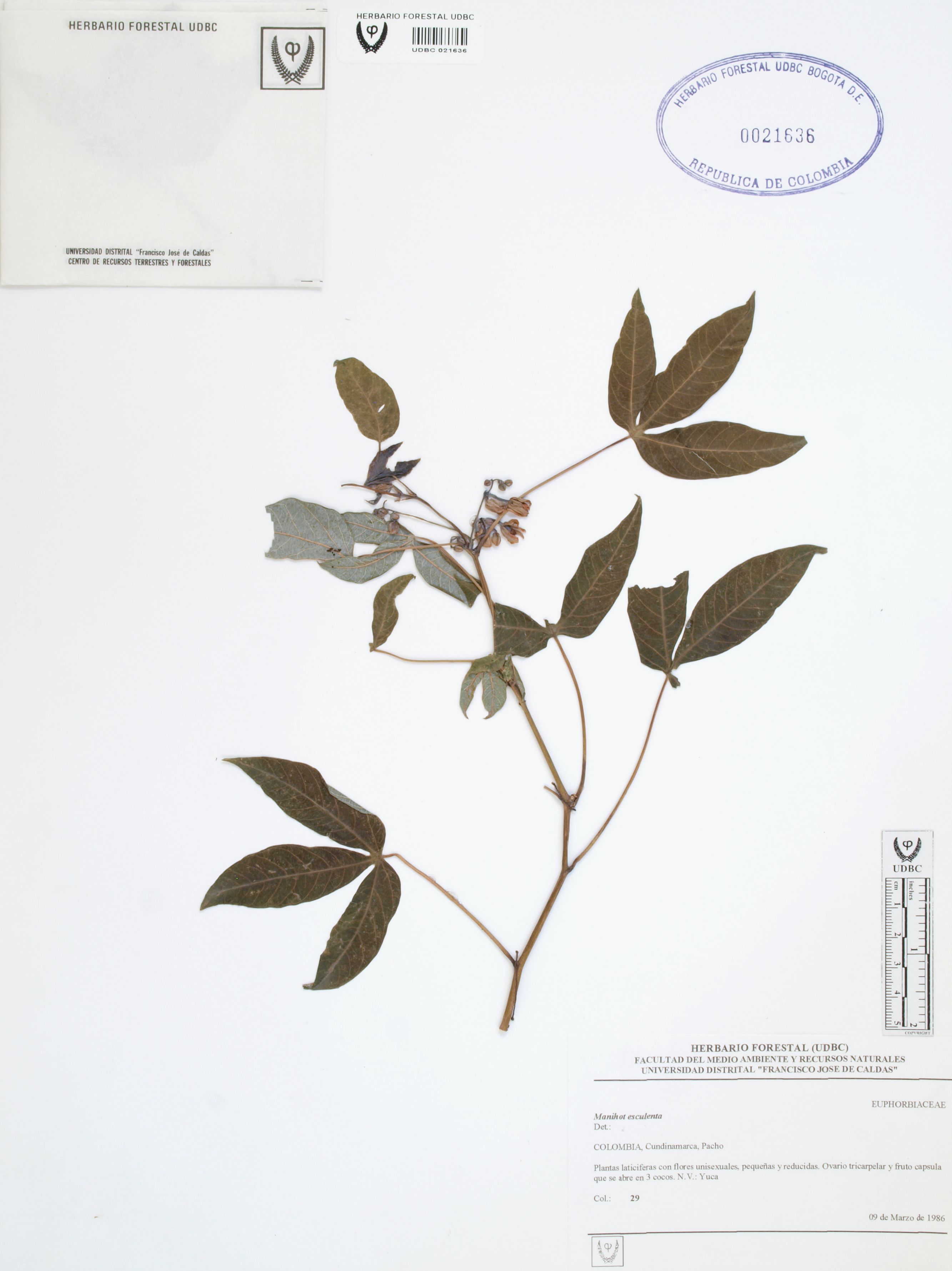 Fotografía del ejemplar SD 29, determinado como Manihot esculenta