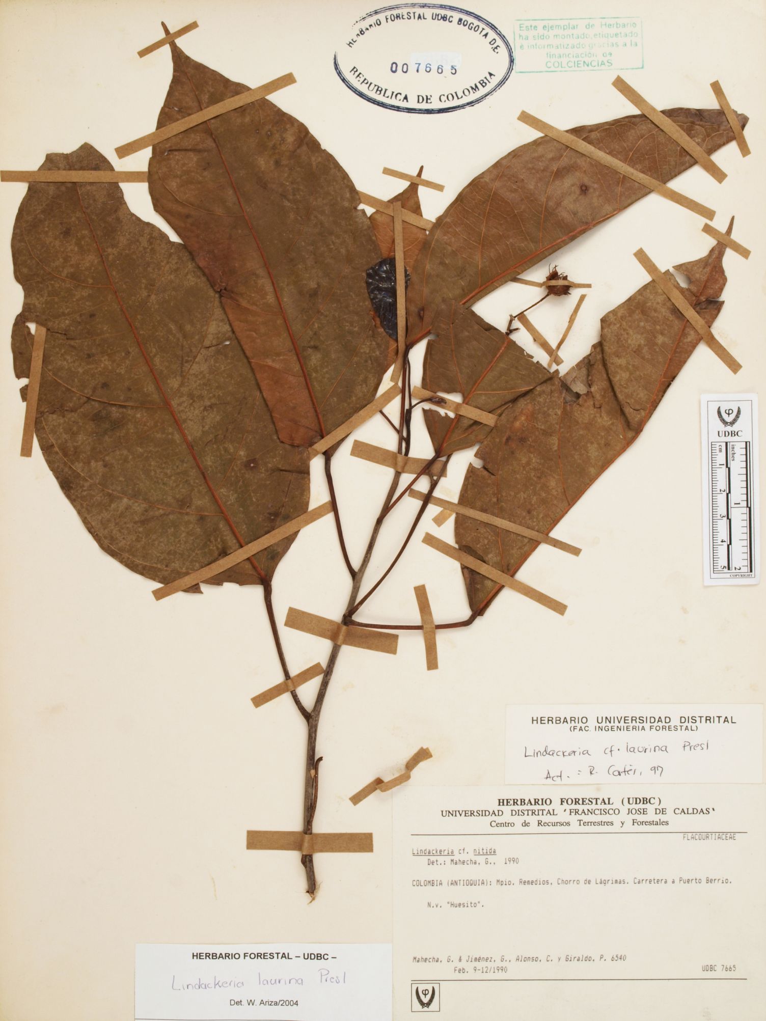 Fotografía del ejemplar Mahecha, G. 6540, determinado como Lindackeria laurina en el año 1997